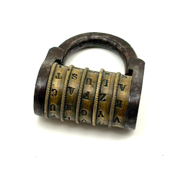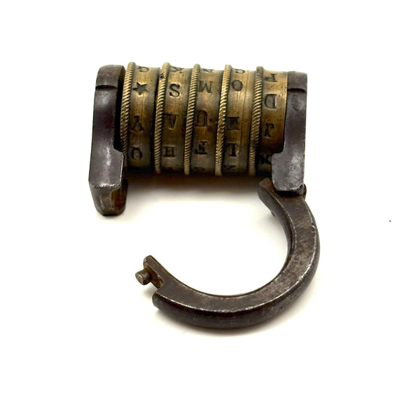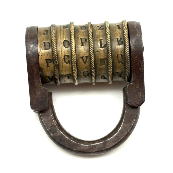 I found an antique letter dial lock of this sort a year or two ago, and have been looking for another since--so lovely, and why ever would we have decided it was better to remember numbers than letters/words??? 18th or perhaps 19th century French, brass and iron/steel, with a nice weight to it, and satisfying tension to the turning of the dials when one gets close to lining up the letters that unlock it. And with a star among the letters on the fifth dial, which feels like a happy thing. (The combination to unlock it is DOMS*.)