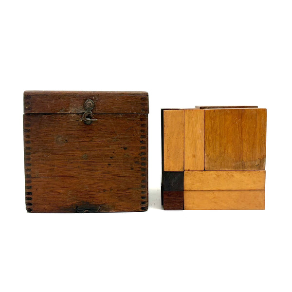 Box measures 3" x 3" x 2 7/8". Hook on exterior of box latches tight. All in good antique condition, with general surface wear; I have not touched the wood (never do) and think it is perfect as found, but one could apply a bit of oil to brighten it all up a little if desired.