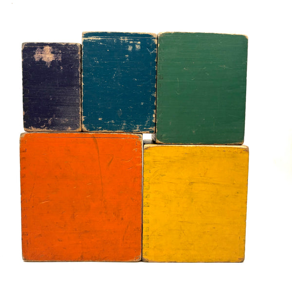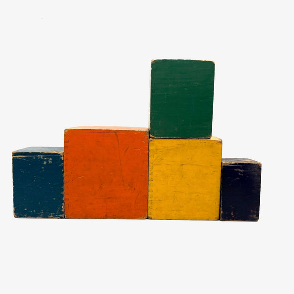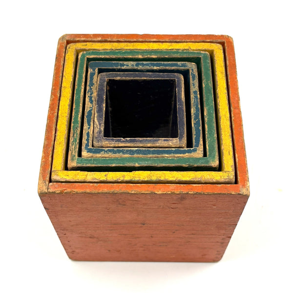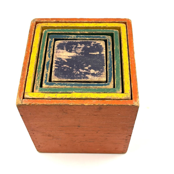 I am forever searching for these--hard to find, it's a very happy day when I do, and whenever I list a set they are usually the first thing sold. The paint and the wear is important though--the paint on earlier sets like this softens and wears away, rather than chips off--I'll never buy a set where the latter is the case! It is possible this set once included a larger red box, but there's five now, with the orange the largest. Jointed corners, great general wear, especially lovely along the top edges as shown when they're all nested. I could spend hours arranging these in different configurations--like tabletop Stella's and Rothkos. Yum.
