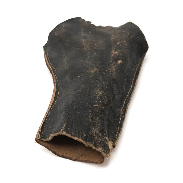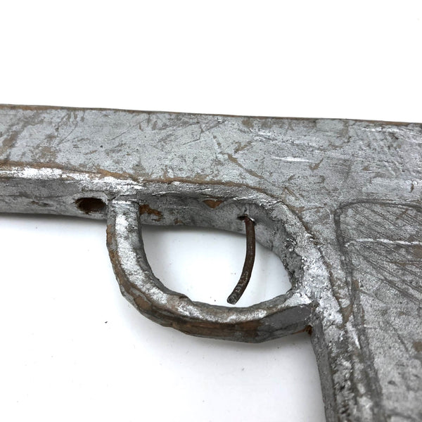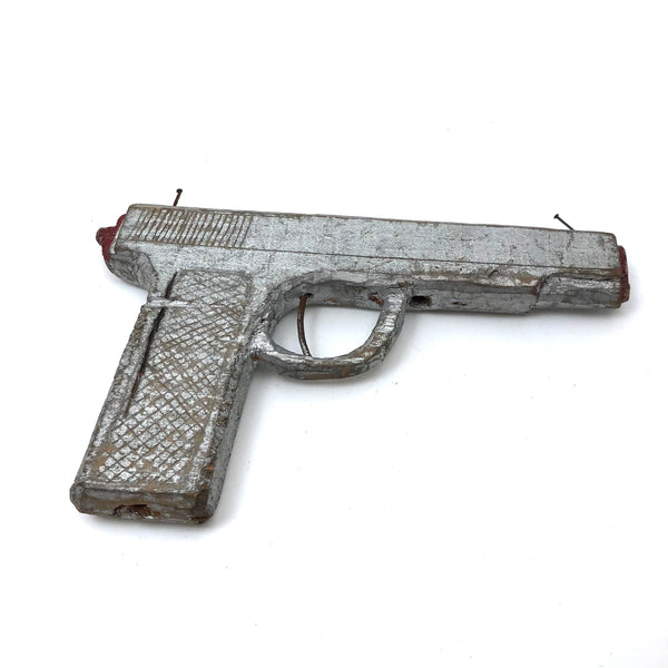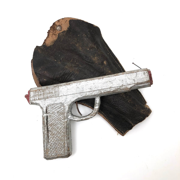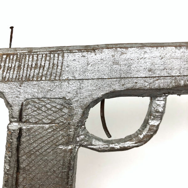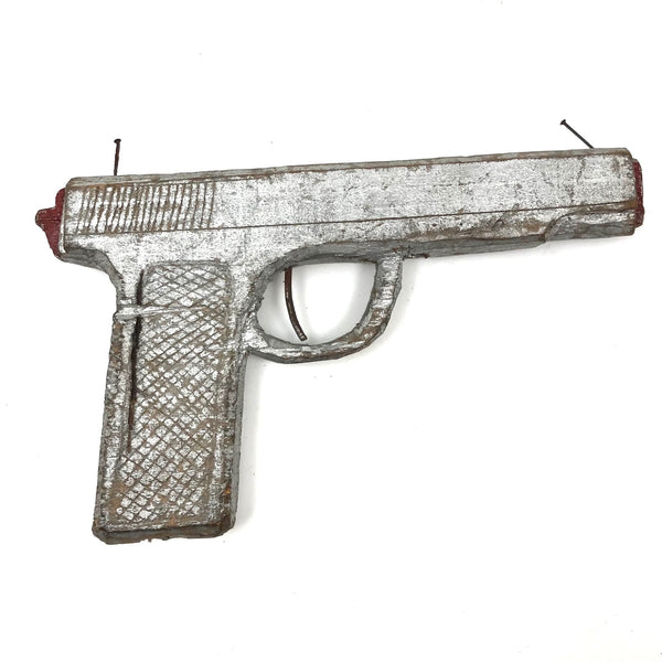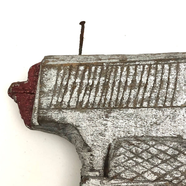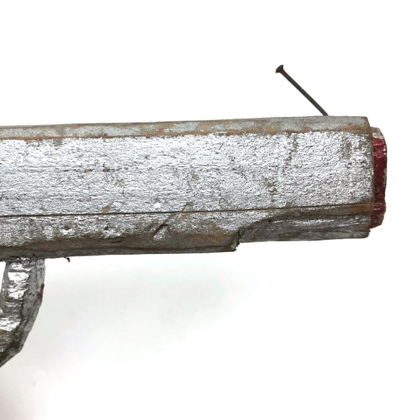 A beauty of an old carved wooden toy pistol, quite iconic looking in its silver paint, and  clearly invested with significant care by a kid long ago, who I'd like to imagine used it only for good. With excellent carved detailing, especially the dense crosshatching on the handle, and a heavy wire trigger, two nails at top for the sights, and an old leather sleeve, with button sewn inside, which I presume once attached to a belt or strap.