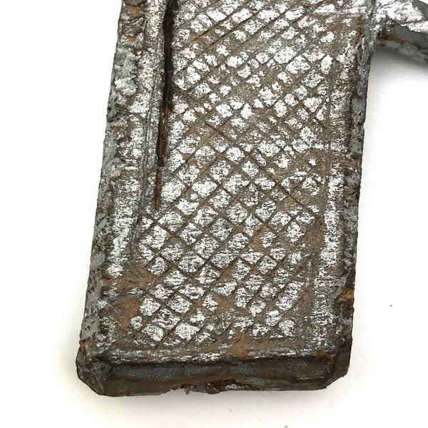 Gun, in very good condition, measures 6 1/4" l x 3 3/4" t x 1/2" d not including nails. Sleeve, which some some loss at top, but which the gun fits inside, is 6 1/2" x 4 1/2".