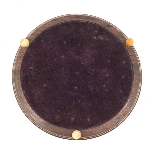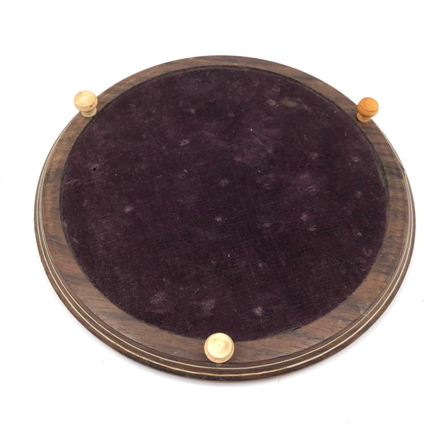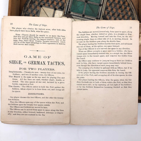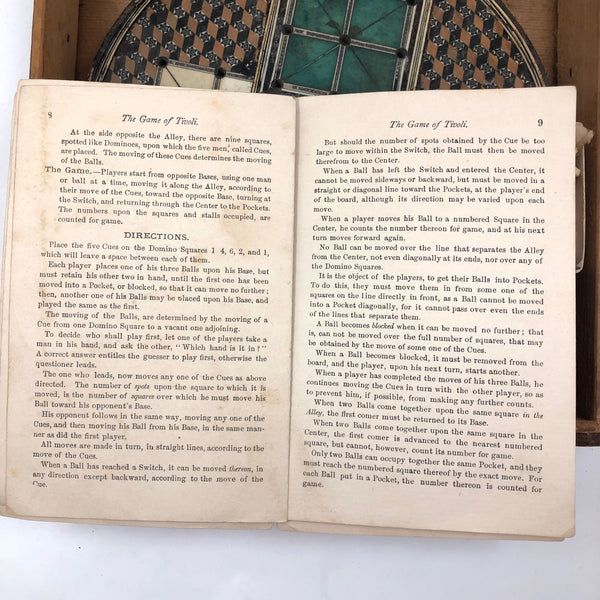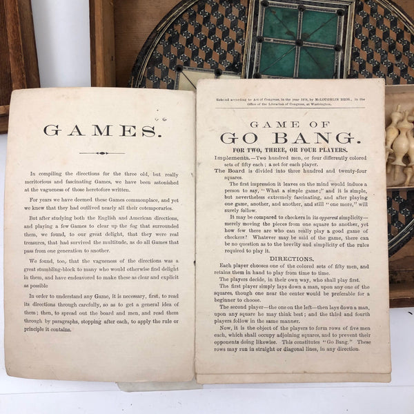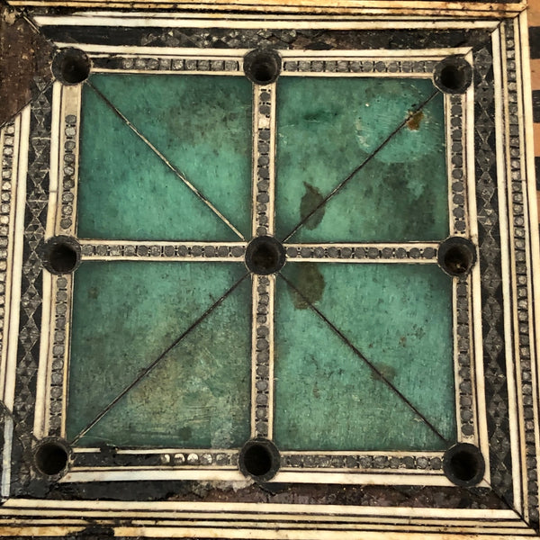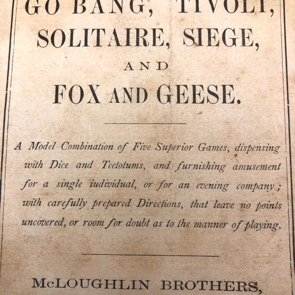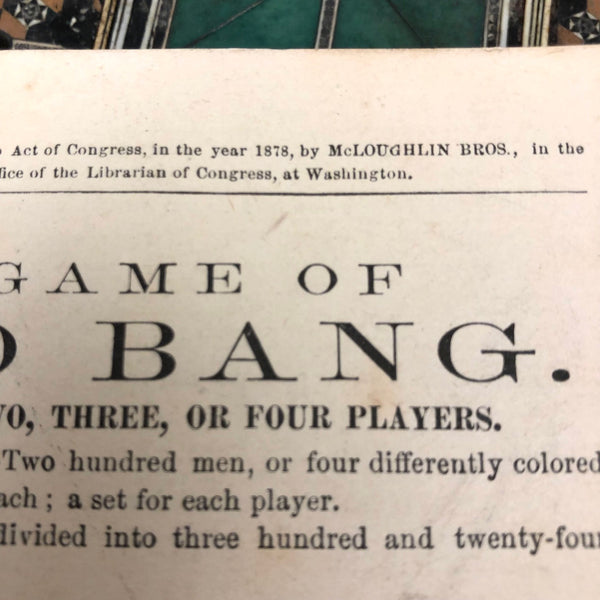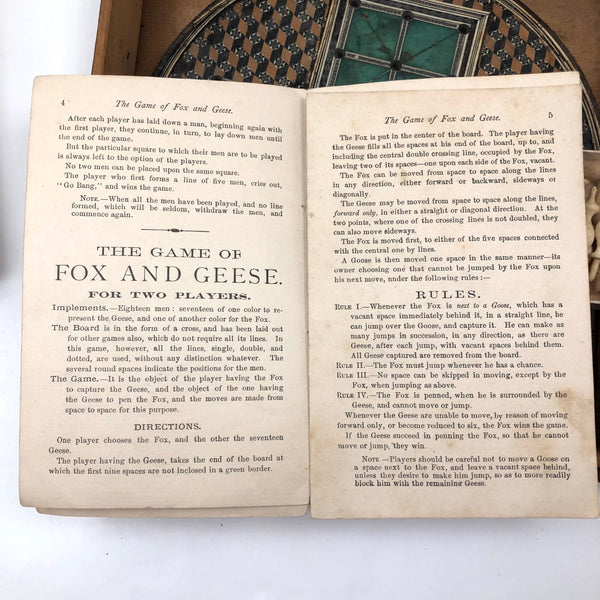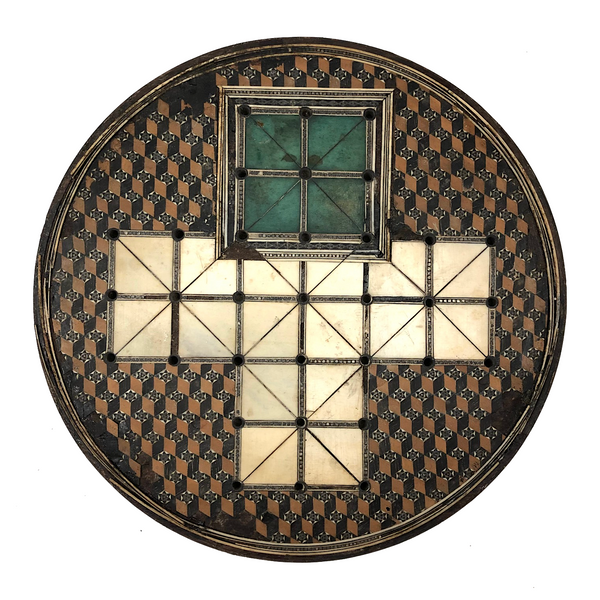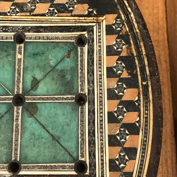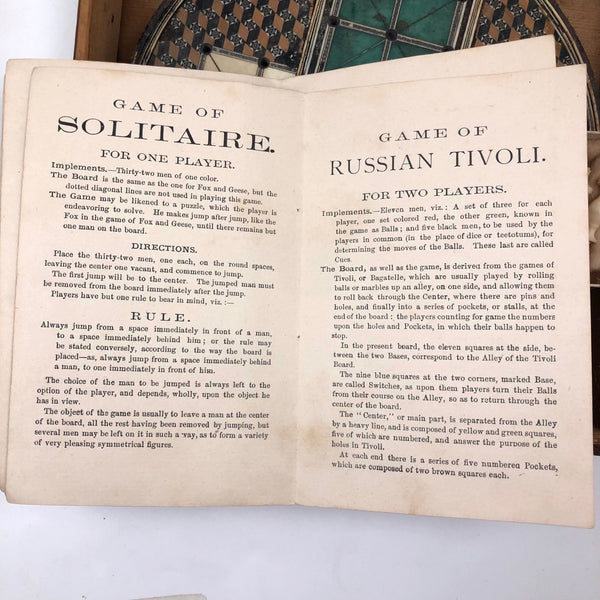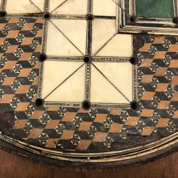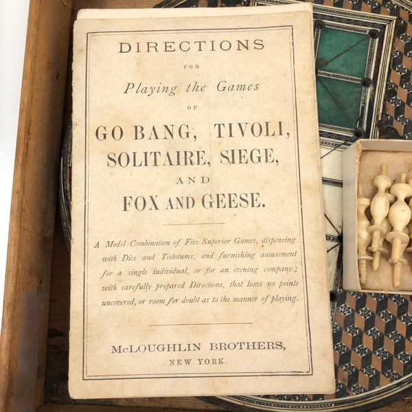 This beautiful thing! I've found not other version of it out there anywhere, and so am not entirely sure if it was in fact distributed by McLaughlin Brothers, who produced the instructions (dated 1878) found inside the box, or whether its one time owner paired the instructions with the board. The board itself is wood inlaid with bone and intricate porcelain (I believe) marquetry, which I believe would be referred to as Sadeli. (A technique believed to have originated n Persia/Iran.) I find the combination of colors and patterns completely gorgeous and would be content just to set it somewhere or hang it on the wall to look at. But here, too, is a set of turned bone pegs (not enough to fill all of the holes on the board, but more pegs like this, to make it a complete set, should not be too hard to find) and what I believe is its original wooden box. Plus the instruction booklet, which provides rules for playing Go Bang, Tivoli, Solitaire, Seige, and Fox and Geese, in a manner that "leaves no points uncovered." Rare, exquisitely crafted and very lovely, standing on three turned bone feet.