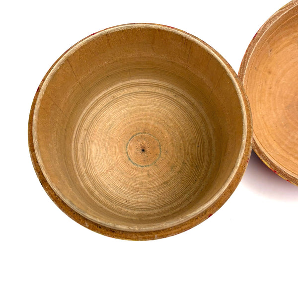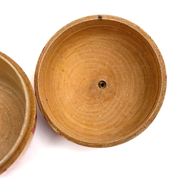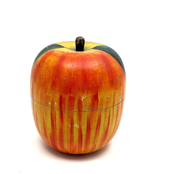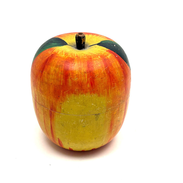 I have an eye out for turned wooden apples at all times, but have rarely found one nicer than this, a large one, in near perfect condition, and the first I've find with green painted leaves, which of course make me think of theorem watercolors. These were made in Japan for the Western market, beginning in the late 19th century/1900 or so I believe, often holding horse roulette game or miniature tea sets inside (the former perhaps the case here, but if so, long gone.) Bright and crisp all the way around, a perfect gift for the apple of one's eye, with plenty or room inside for additional treats.