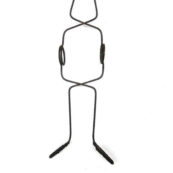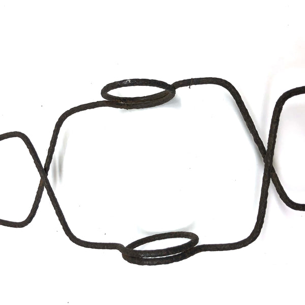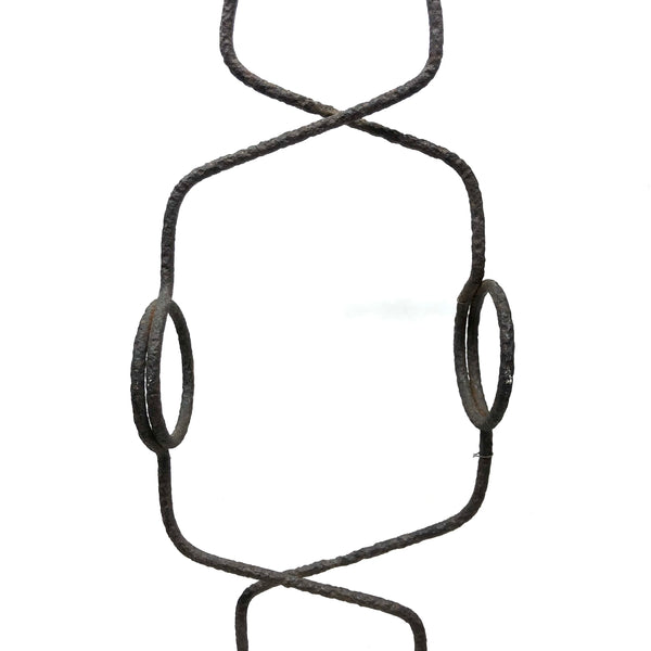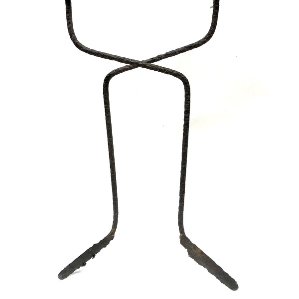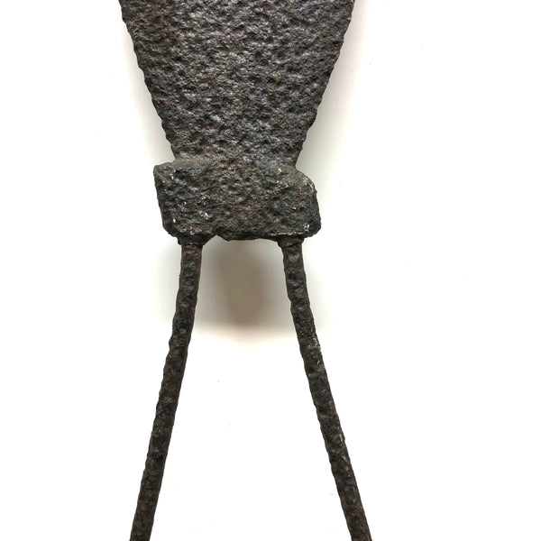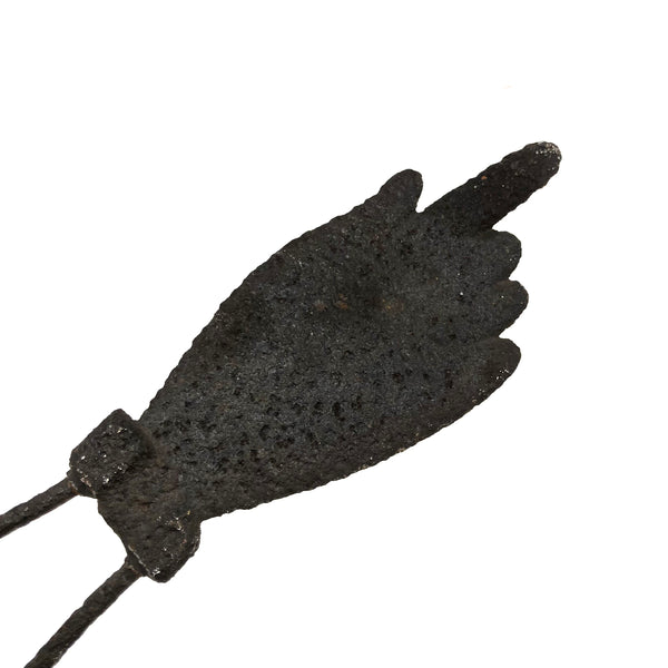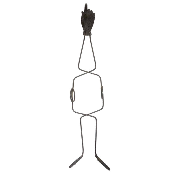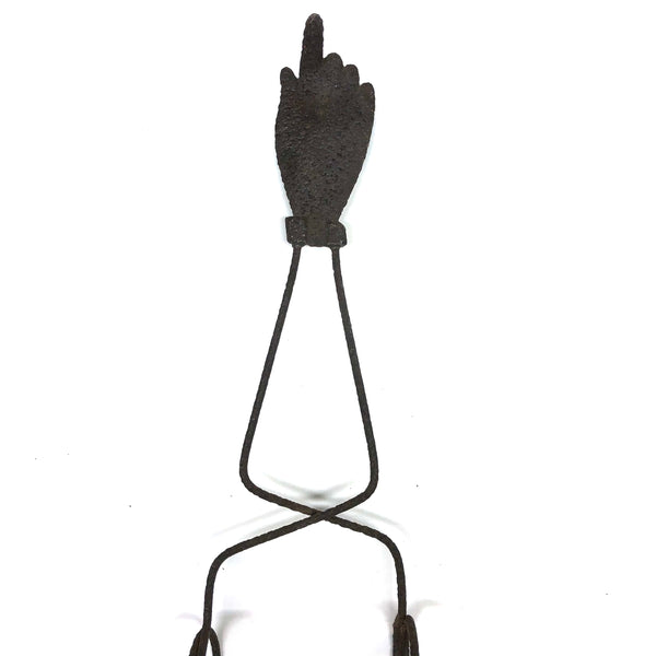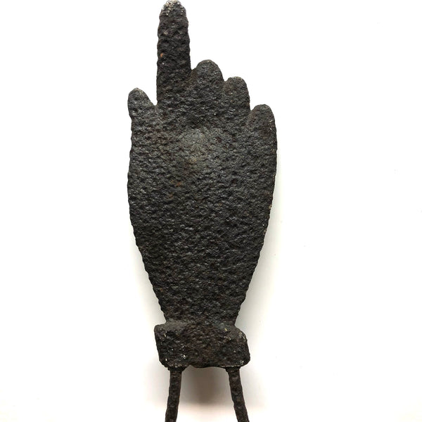 Fabulous. I purchased this one from a favorite dealer couple in southern Maine, who have a great eye for the graphically appealing, an appreciation for antique iron, and knack for finding unexpected things. 19th century I believe, this I believe would once have been the vertical piece of a lightening rod, designed to protect buildings from lightning strikes and fires by attracting lightning bolts and channeling their energy into the ground--with the iron hand pointing heavenward. I believe a horizontal weathervane spinner would likely have intersected it at the middle where the loops are, which squeeze together tight and would have been held in place that way. Now, just fantastic mounted on the wall, pointing up, or down, or to the left, or the right--useful for signaling all sorts of things! Unusual, with perfect patina to the iron.
