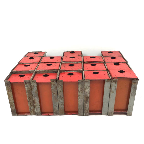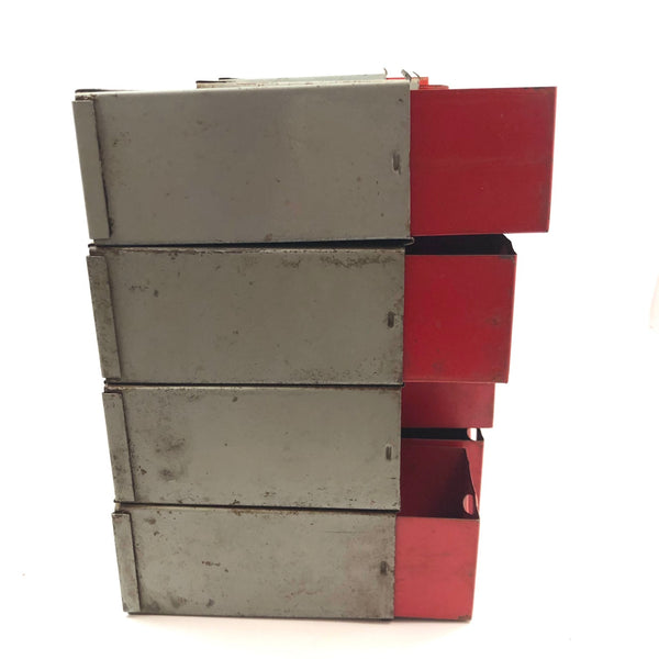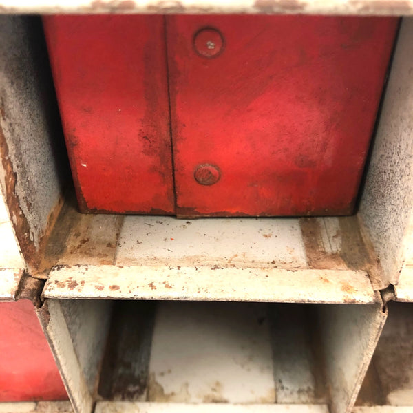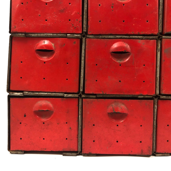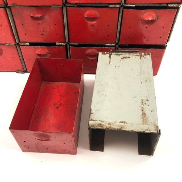 Just looking at this makes me want to become the kind of person who has all my nails and screws (and tubes of super glue), etc. sorted into individual drawers (which is far from the current case!) But it's so fabulous looking I might rather not relegate it to the basement! Everything about it except for the red paint makes me believe it is a Dorman Products Hardware storage cabinet from the 1950s or so, the examples of which I've seen were orange, used in hardware stores, and printed with details about various sized screws, etc.  The underside of the drawers on this one are indeed orange, so it seems possible the red paint came a later, but it's a perfect coat, I see no orange underneath it, the interior of the drawers are completely red, and the red sure seems to me as if it has always been there.