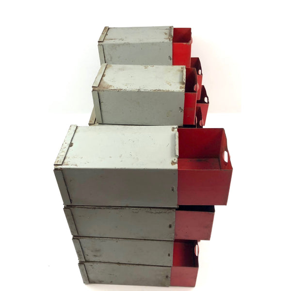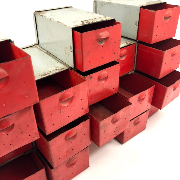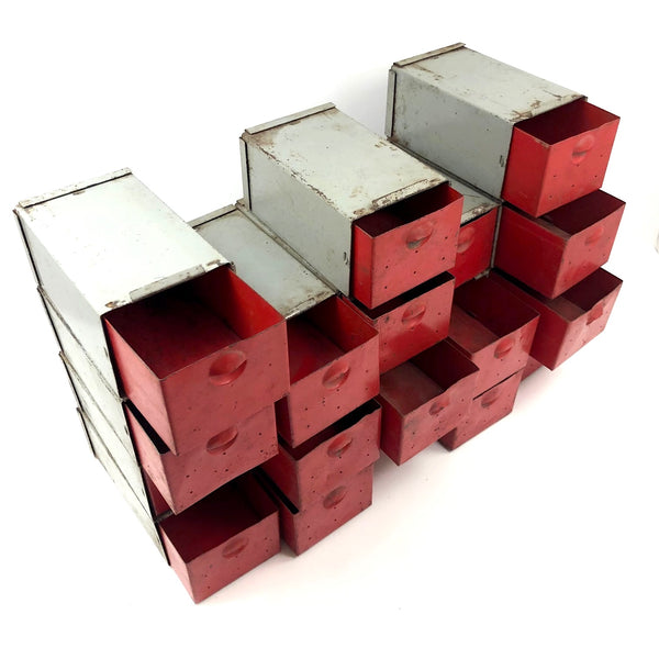 The drawers interlock and with a little effort could be reconfigured (I have moved around the top tier drawers to try it, but have not taken apart the whole thing, and can't guarantee that every drawer will disassemble easily). There were probably once at least as few more drawers to make a complete grid. There is one sticky drawer but the rest slide open easily. Some rust and aging for sure but overall good condition and definitely with many good years of use left in it.