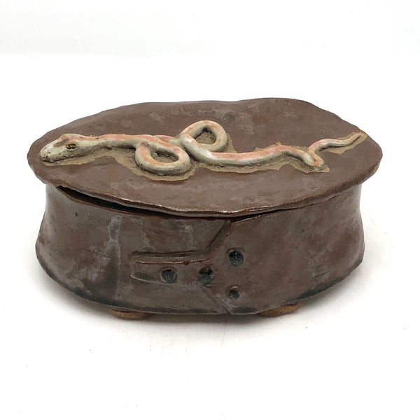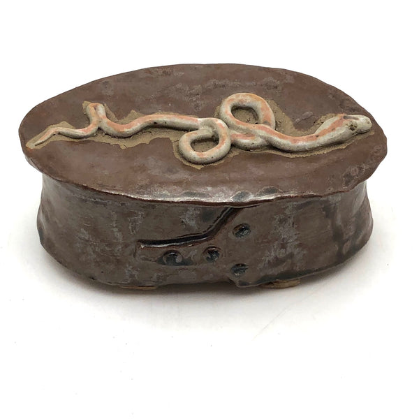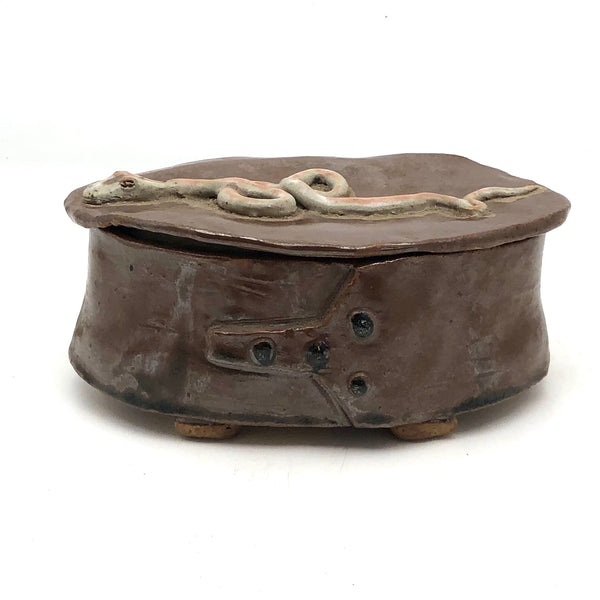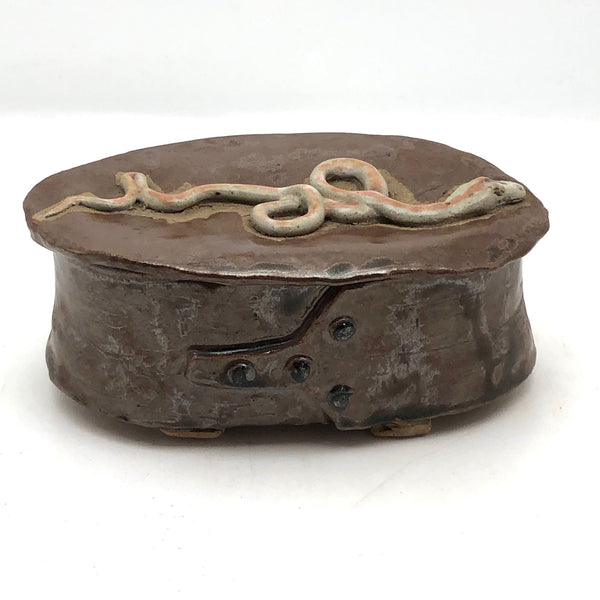 Well if one is hand-building a vessel anyway, why not roll out a long piece of clay so that a snake might slither across the top? And even better than it have a pinkish-peachy stripe all the way down its back, and an unglazed area around it making it feel as if its slithering through the sand. This is signed Robinson on the underside, and I think could be an early piece by James Robinson, a studio ceramicist from Keene New Hampshire (very near where I found this) who studied at Southern Oregon State College, Ashland, Oregon and now lives and works in Medford, OR.