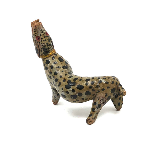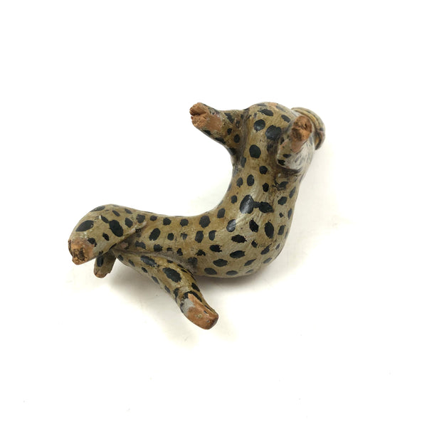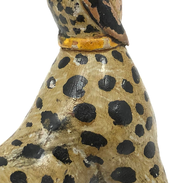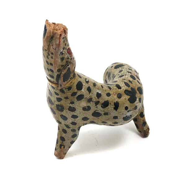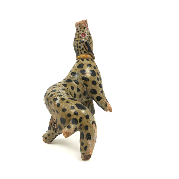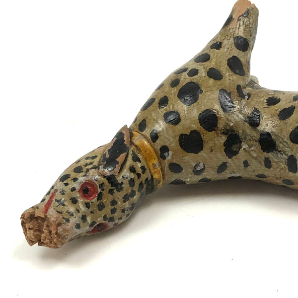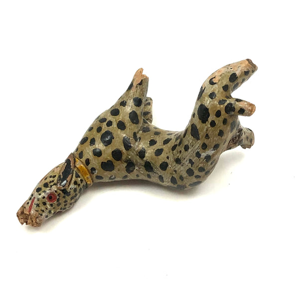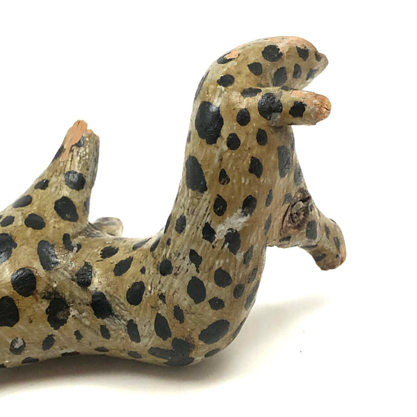 This! One of two leopards today, which alone mean it was a good week. And quite a singular thing this one, made of a piece of root wood, lending it this wonderfully snaking and twisting body. Something appears to have gnawed a bit at its snout at some point, resulting in some loss and roughness there, and the end of one leg shows a little loss too--but what remains is so good and so full of life I don't much care! Terrific old paint, black spots everywhere, and bright red eyes and mouth pointing up to the sky as if howling at the moon! Hugely empathetic.