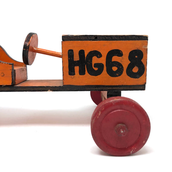 I'm not sure if this car--and another by the same maker listed separately--was made as a model for a full scale soap box derby race car, or just as its own thing, but I sure love it. (And I personally am more than happy to leave the driving to a non-human, who can't get too hurt!) The front axle turns a full 360 degrees, and it rolls along great, so it would certainly make a wonderful toy for the kids, but really it's a pretty fabulous folk art piece and I'd definitely keep it for myself.