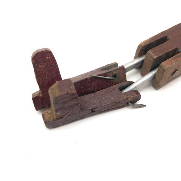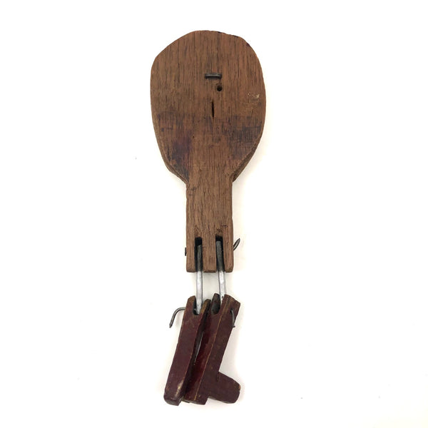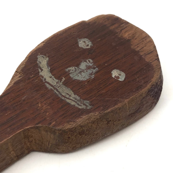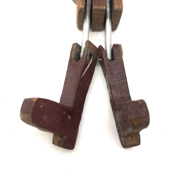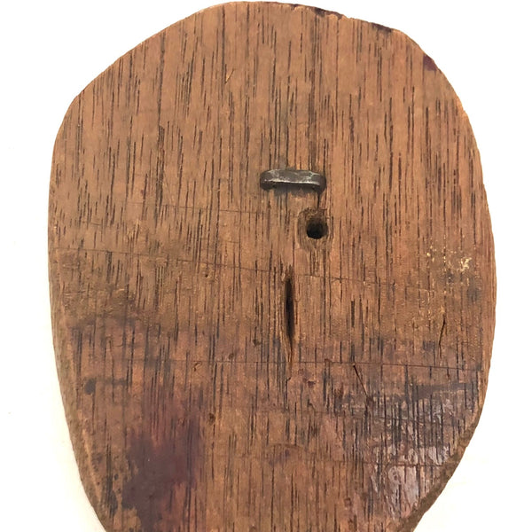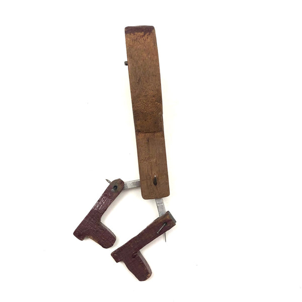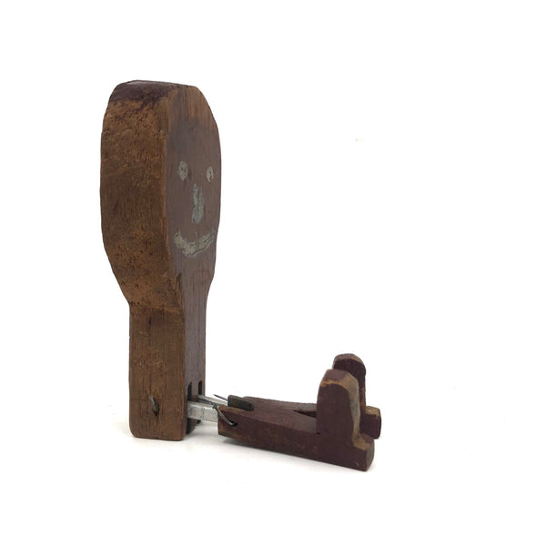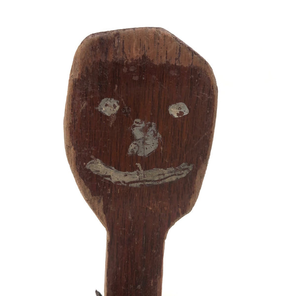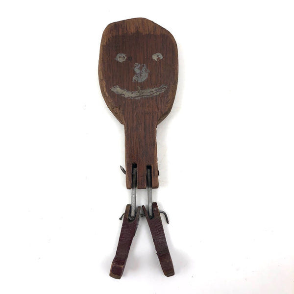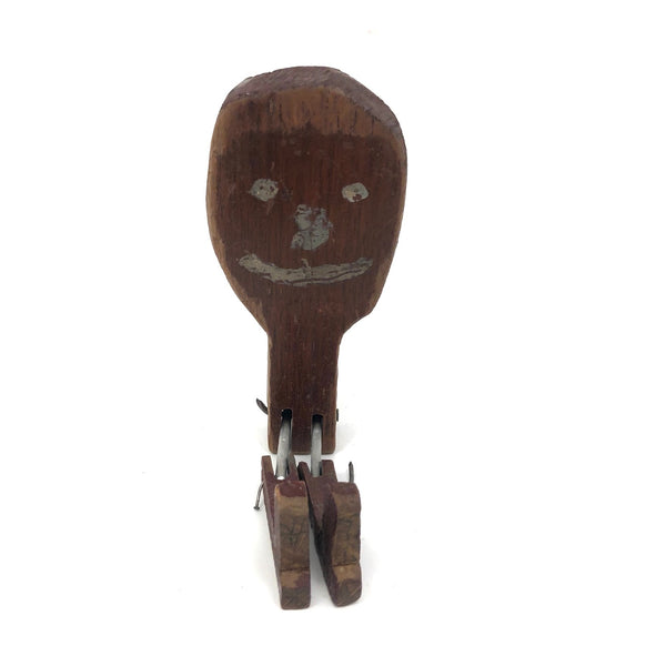 What a face, and what a charmer! I would assume this head was originally attached to a torso complete with arms and legs, but I really don't know for sure. Whatever the case, I think the large smiling head joined by pins through metal posts to the primitively carved, dark red painted boots now is quite perfect, and the heels on those boots to my eye at least impart him with the feel to me of a cowboy, and a dancing one at that. Fabulous.