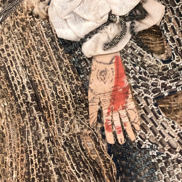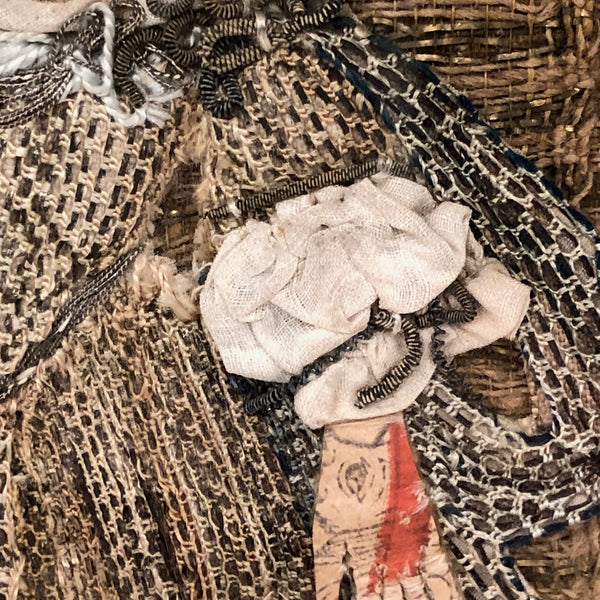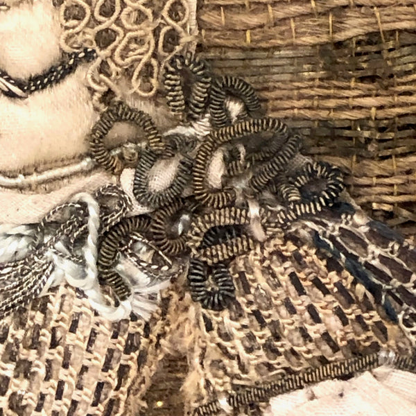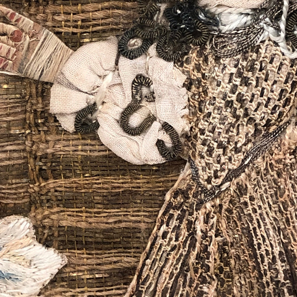 This one. I purchased her from a dealer in my neck of the woods with really exceptional things all pretty much all beyond my reach, but this came along with a much more elaborate 17th c. stumpwork, which was his interest, and so I was able to attain her--and I do feel as though she travelled across nearly four hundred years and an ocean just to be found by me! I mean, look at those hands!