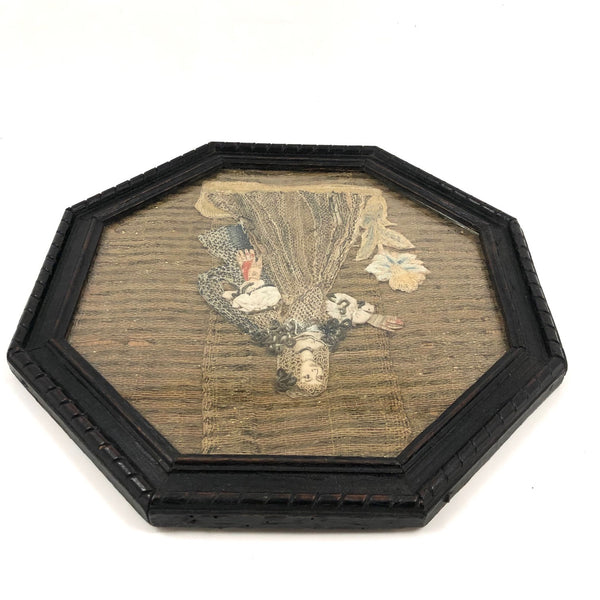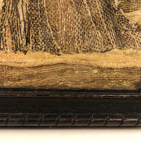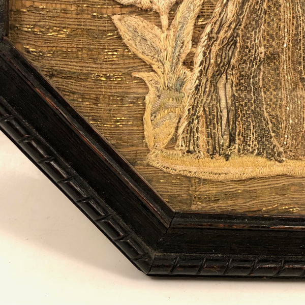 Fantastic 17th Century English Needlework Fragment, Portrait of Young Woman with Large Hands and Flower