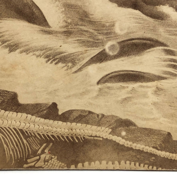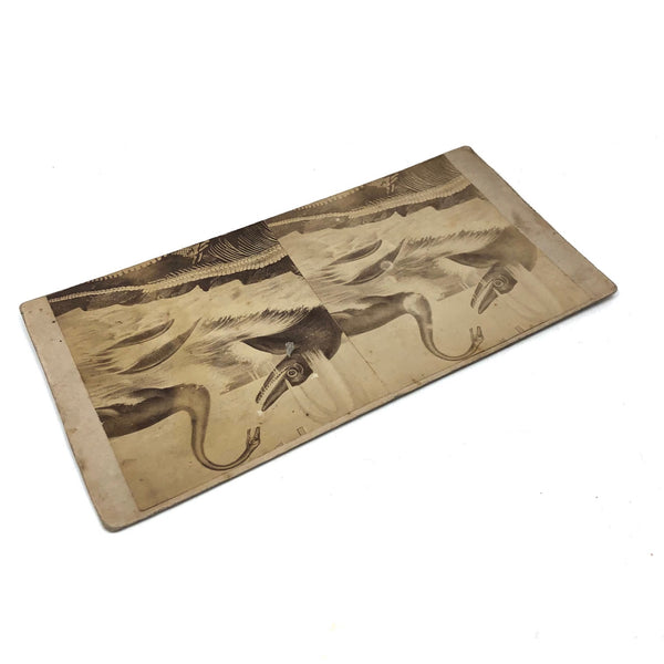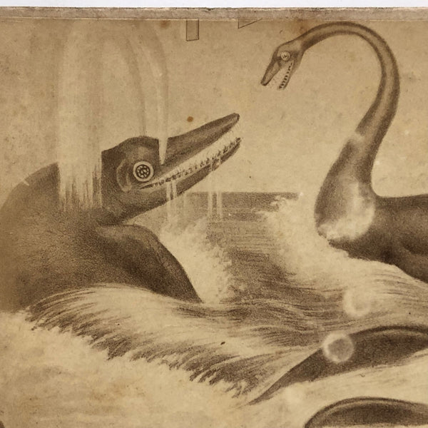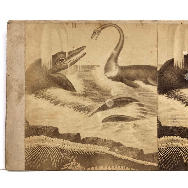 There are stereoviews and then there are stereoviews--this is one of two early albumen photo stereoviews I'm listing this week of the gorgeous and special variety; a different species entirely from the later stereocards with images printed on the card. And this is a curious one, too. The image is very similar to an engraving ("Ideal Scene of the Lias Period with Ichthyosaurus and Plesiosaurus") in French scientist Louis Figuier's 'The World Before the Deluge,' published in 1862 and with a revised printing in 1872--but that does not seem to be the precise source; I've included an image in photo documentation for comparison. I'm really not certain, but perhaps the photo here was taken of an original watercolor upon which the engraving was based? Whatever the case, what a fantastic image of these wonderful long lost sea creatures with bones spread across the rocks in the foreground, made all the moodier and more magical feeling captured as 19th century photographs, and with the right image printed more darkly than the left, adding to the dynamism of the doubling as well as the singularity of the card. I could look at this one all day long.