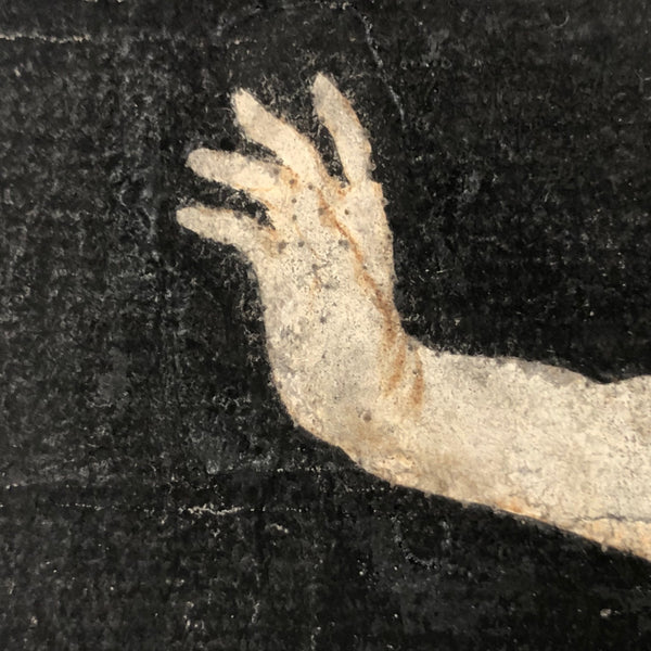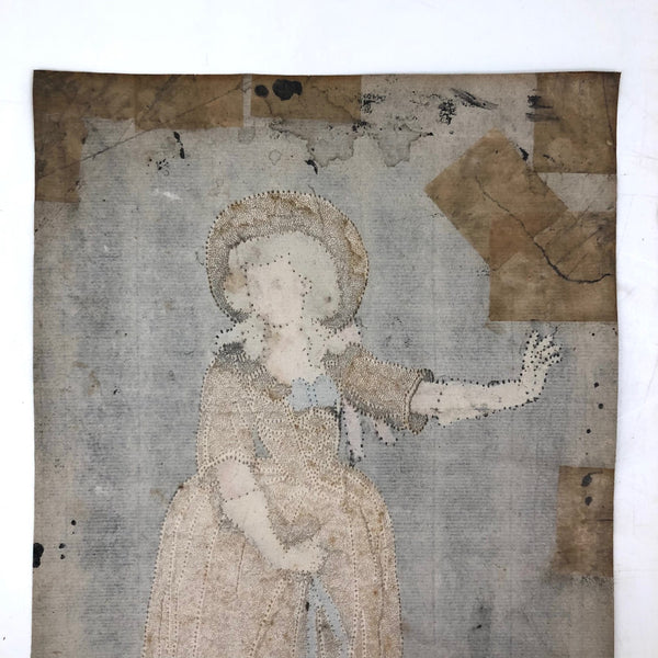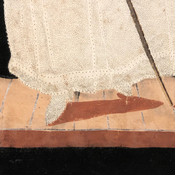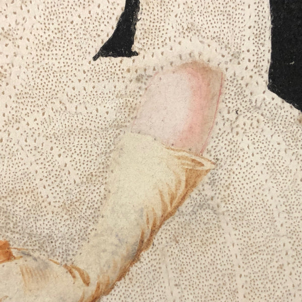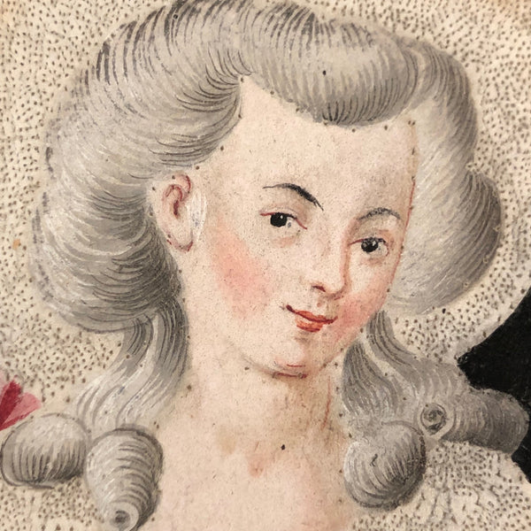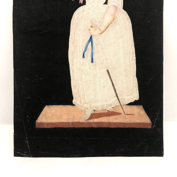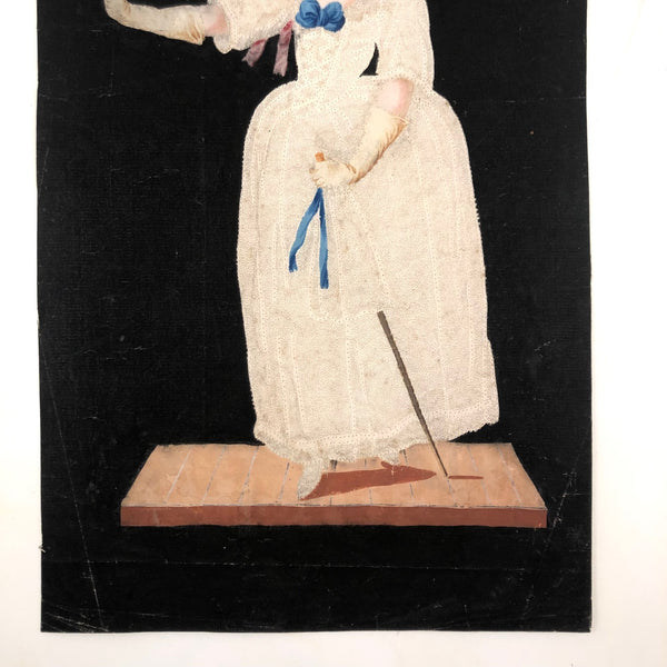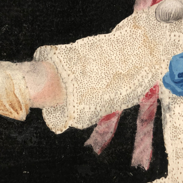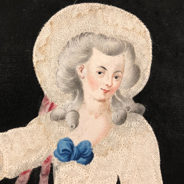 I've long been marveling at early 19th century pin prick works, which I find completely extraordinary and which make this gouache/watercolor as fantastic from the back as the front! (I might frame it with glass on both sides so not to lose the beauty of that!) And this I think is an exceptional example in the quality of the portrait and detail of the pin pricking. But what additionally makes it for me though is how wonderfully the black ground makes the portrait pop, and especially how the peach platform she stands upon (casting a terrific shadow) just floats in space, making it feel quite contemporary as well as otherworldly. And, too, how the top of her parasol is not painted at all, just white against white, defined entirely by the pricks to the paper, and by the blue ribbon at top and handle below. And finally, this gracefully raised hand, as if to say go away, but also come hither.