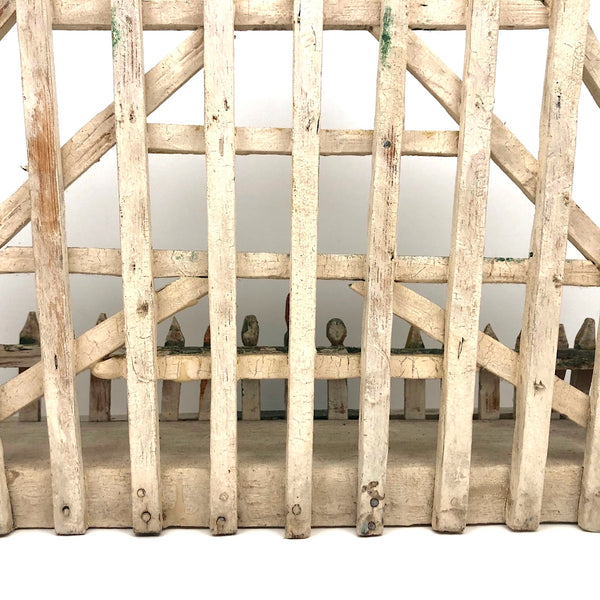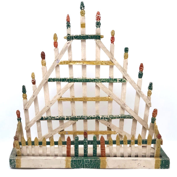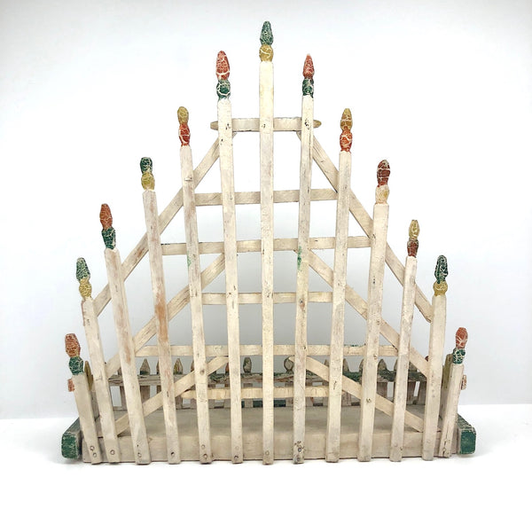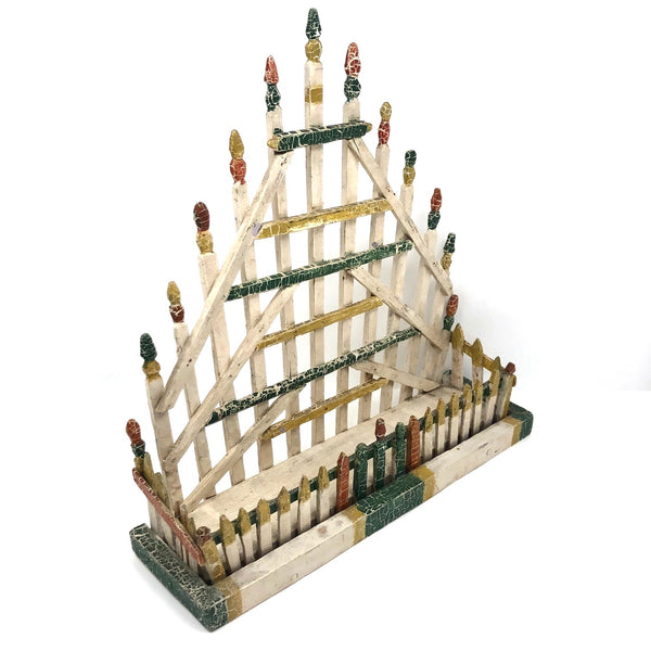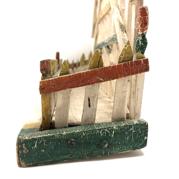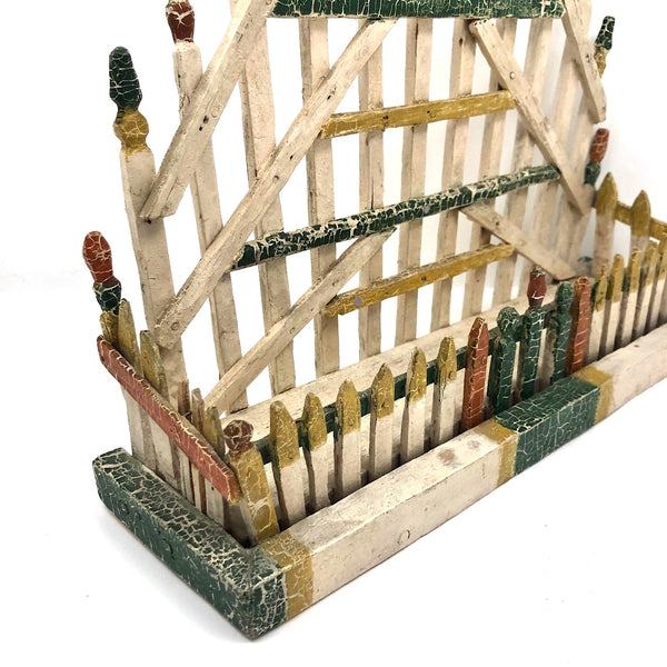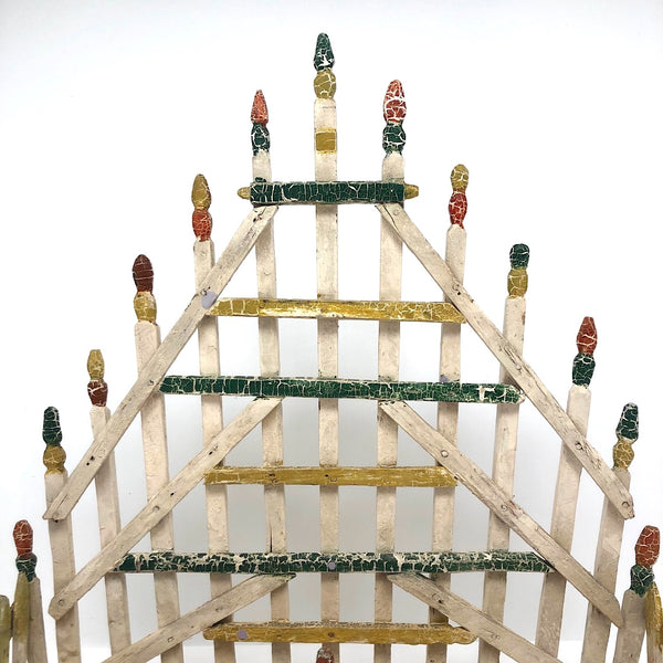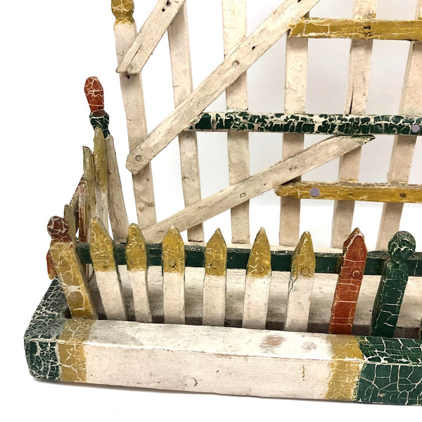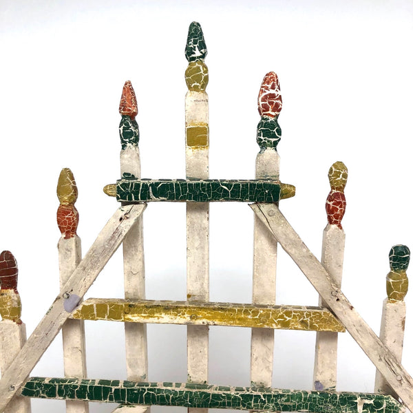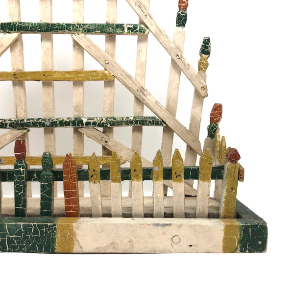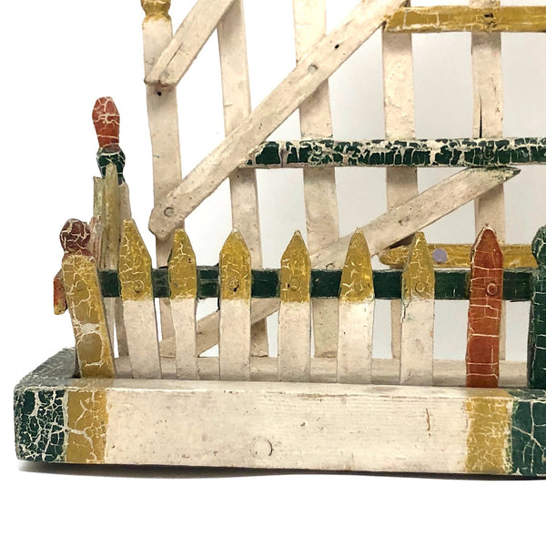 1920s or 30s I would guess. Really in terrific shape, without a missing bit that I can see. There is one piece on the left side section of the bottom tier fence that is split, no real matter at all. 14" tall x 13.5" wide x 3.75" deep.