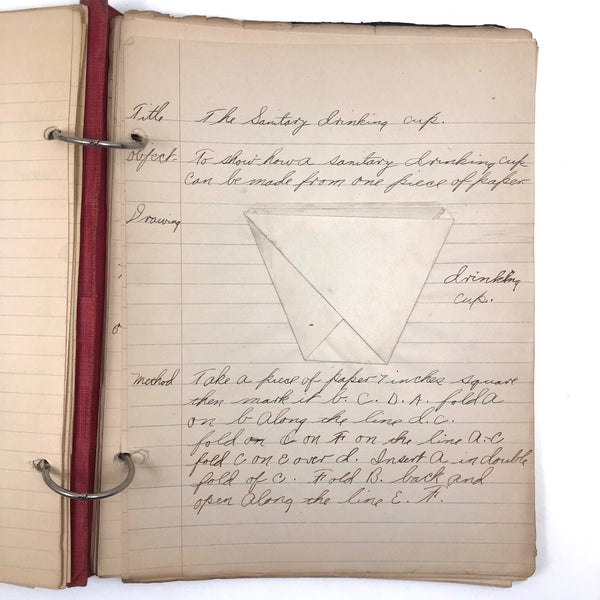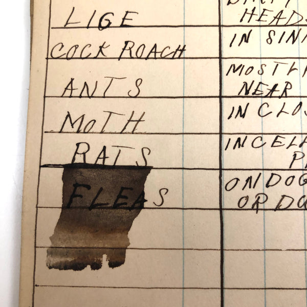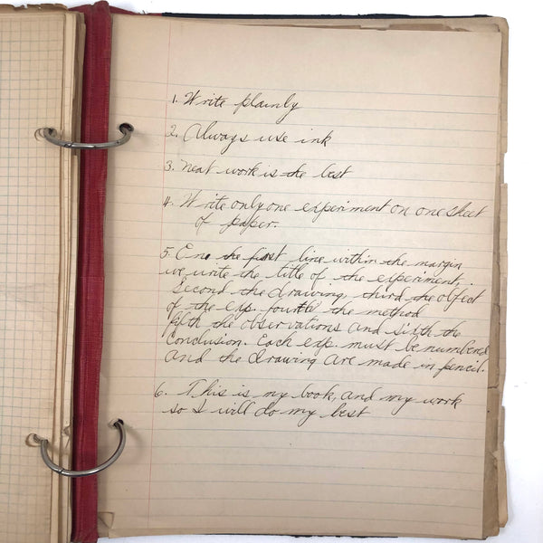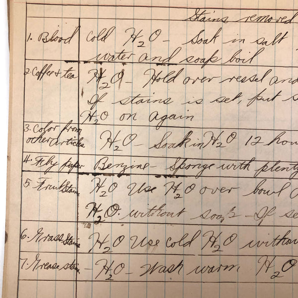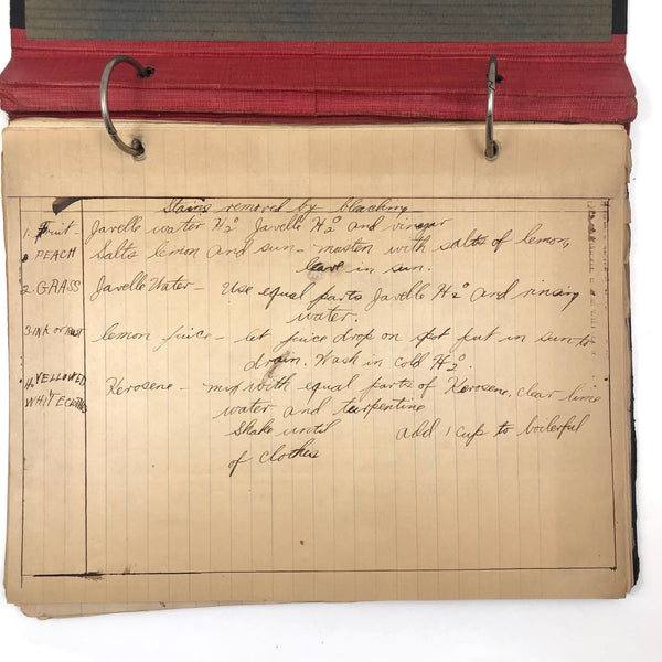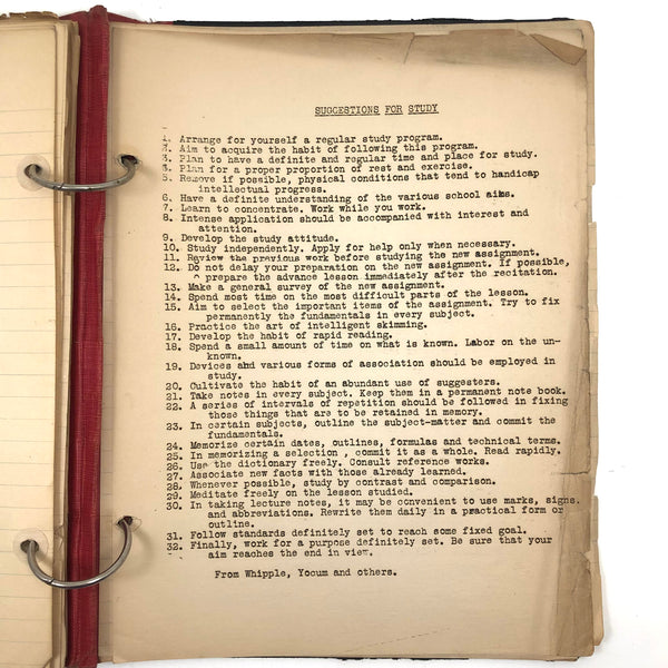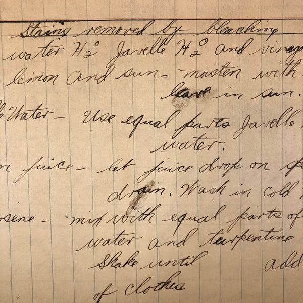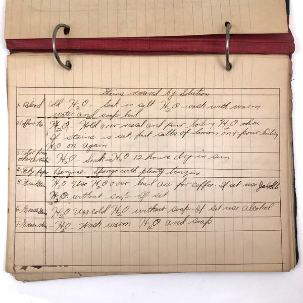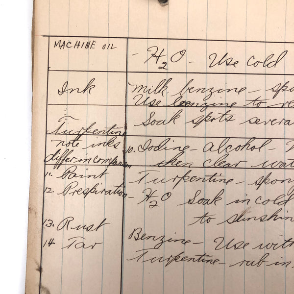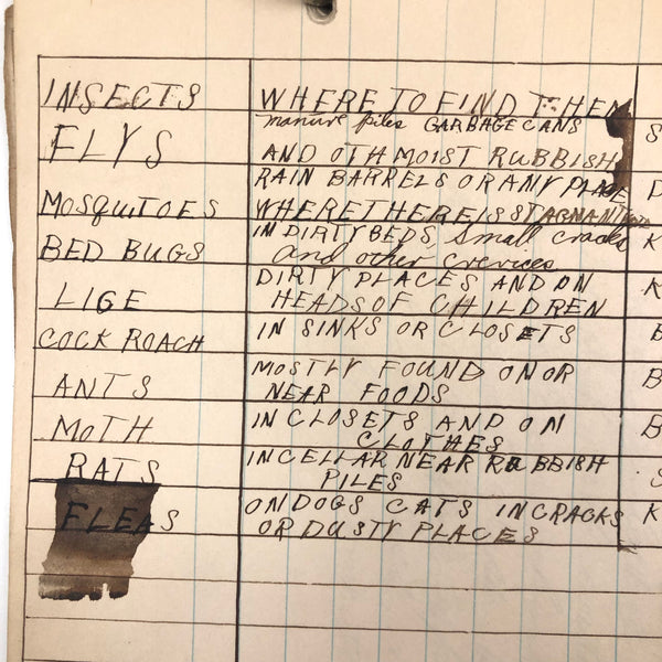 Things like this old school binder full of notes give me great joy--so much poetry to some of these pages when regarded as stand alone things now, and these also adding up to something of a portrait of 8th grade in 1926. Multiple subjects covered here--the majority of pages science related to various extents (some chemistry, some more like home ec-- and then some English language (including a few great lists of words learned this year) and some pages of poetry, too. My very favorite (pictured first) charts a handful of common insects, including "where to find them" and "how to rid them." Other pages detail how to remove various sorts of stains, how to test for the presence of pure wood, cotton, or linen, and how to make a folded paper drinking cup. A few diagrams relating to human organs, science experiments, and organizing time in the day, too, plus lots of other delights.