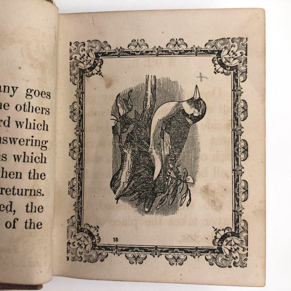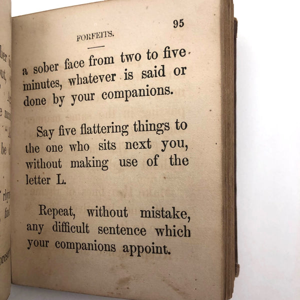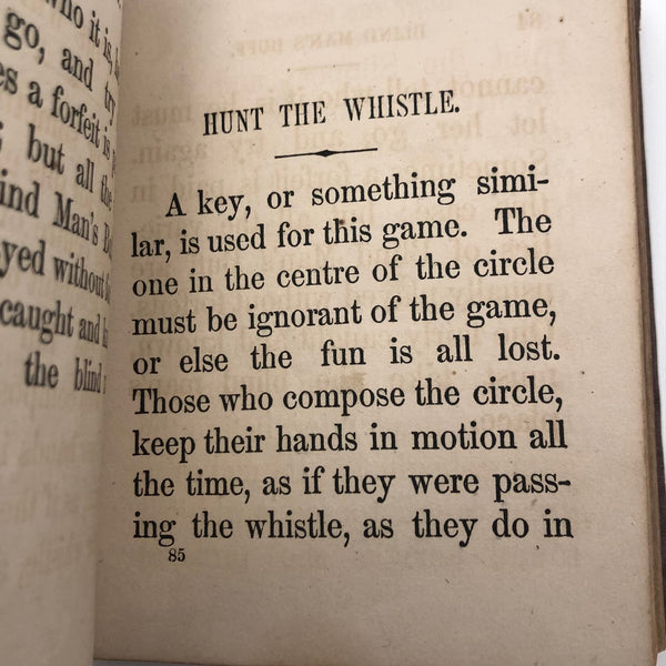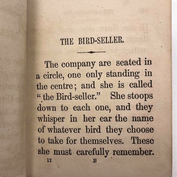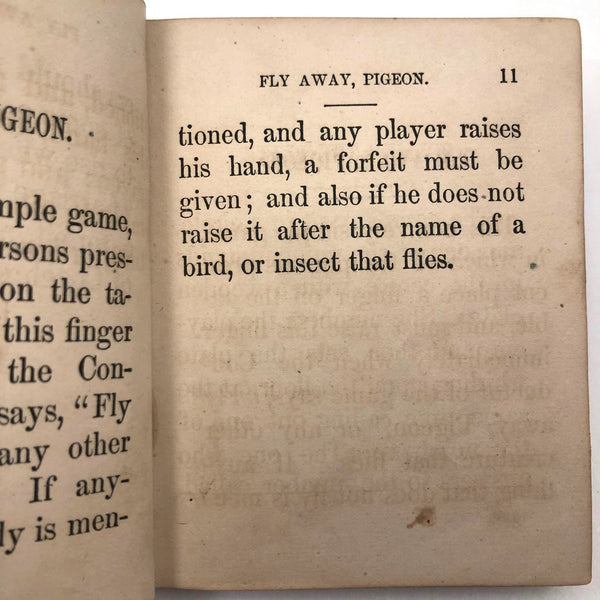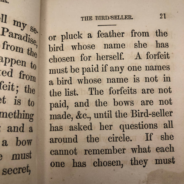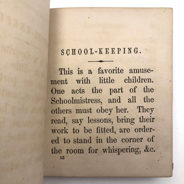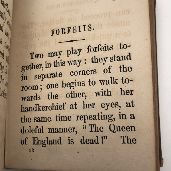 I found this one in a rare book store in Portland this past week and have become rather obsessed with it! There is no title page or publisher's information inside so I'm not certain of the date, but between the hand laid type and the engravings and the embossed spine, I'm guessing 1840s or 50s, and British. What's fascinating is the very elaborate and often quite fabulous nature of the games described--mostly parlor type games that range from an early version of duck duck goose to performative word games where each player assumes the name of a type of bird, say, or a profession, and each has to make recitations according to a very particular set of rules, often involving extensive recall of the names and roles and hierarchy of everyone else. It makes for great reading, and would be more fun to actually play some of these, many of them I think as good for adult cocktail parties as kid's birthdays. Later in the book is a section of advice for children, from how to treat elders to how to take care of fingernails and clean teeth. Quite a lesson in Victorian morals and manners, and great fun. I can find no other copy or mention of this book out there anywhere.