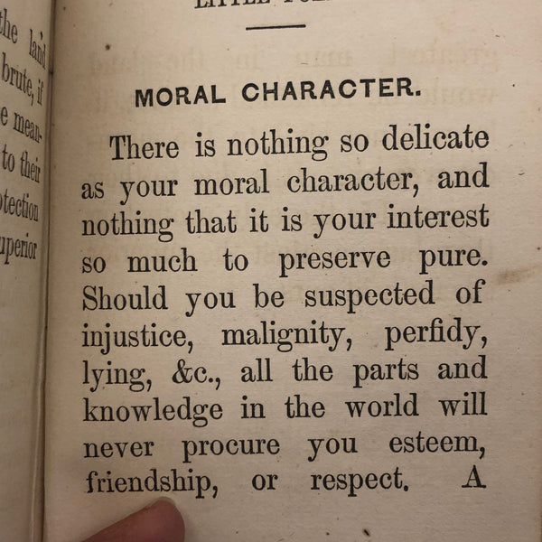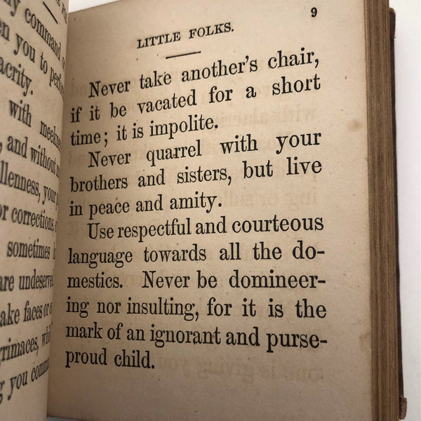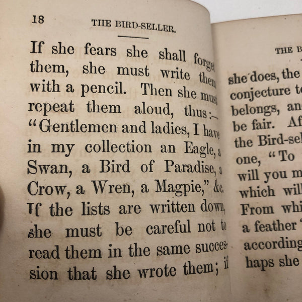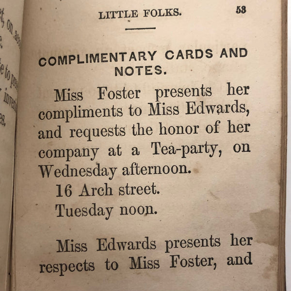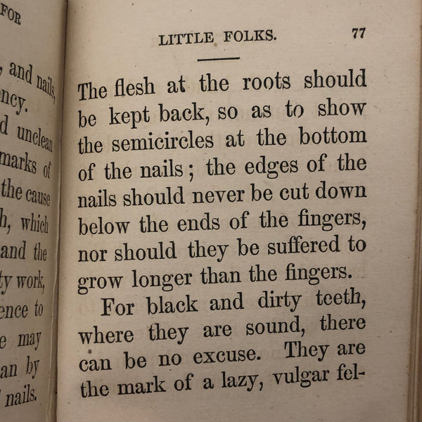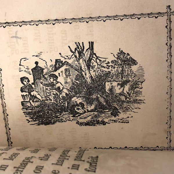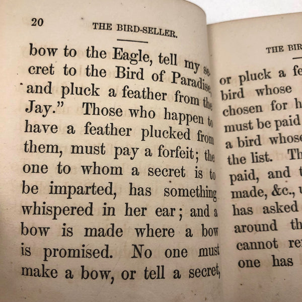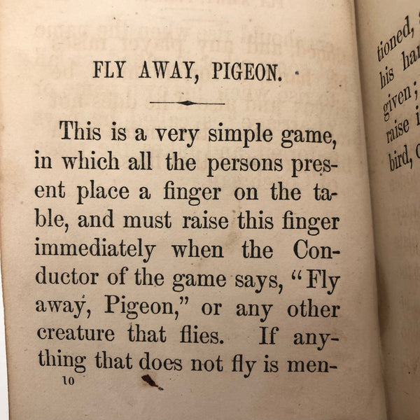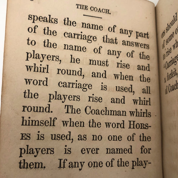 I found this one in a rare book store in Portland this past week and have become rather obsessed with it! There is no title page or publisher's information inside so I'm not certain of the date, but between the hand laid type and the engravings and the embossed spine, I'm guessing 1840s or 50s, and British. What's fascinating is the very elaborate and often quite fabulous nature of the games described--mostly parlor type games that range from an early version of duck duck goose to performative word games where each player assumes the name of a type of bird, say, or a profession, and each has to make recitations according to a very particular set of rules, often involving extensive recall of the names and roles and hierarchy of everyone else. It makes for great reading, and would be more fun to actually play some of these, many of them I think as good for adult cocktail parties as kid's birthdays. Later in the book is a section of advice for children, from how to treat elders to how to take care of fingernails and clean teeth. Quite a lesson in Victorian morals and manners, and great fun. I can find no other copy or mention of this book out there anywhere.