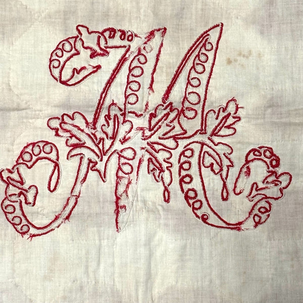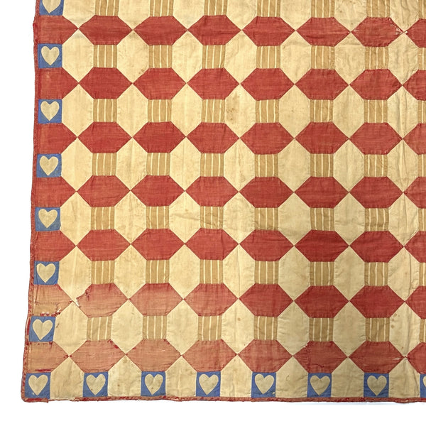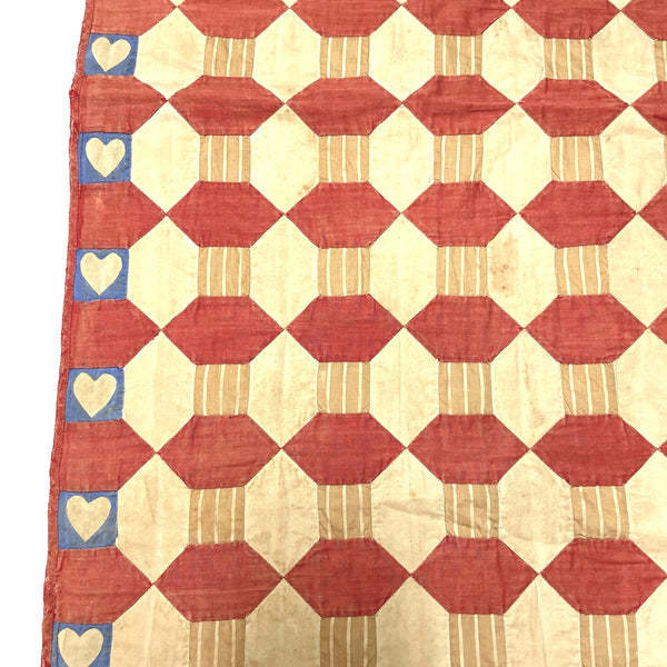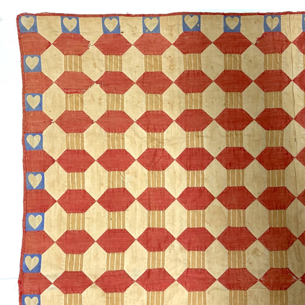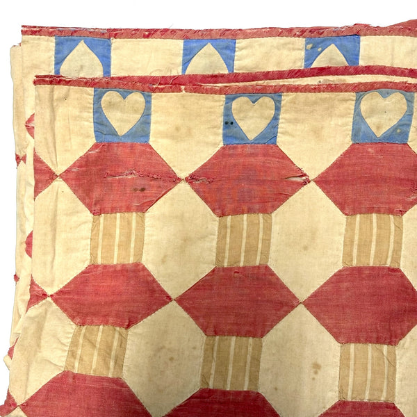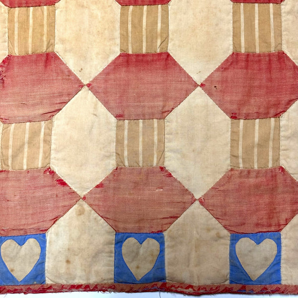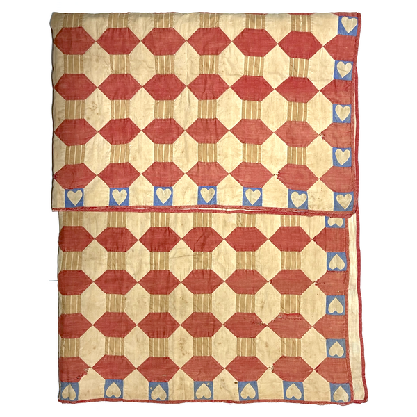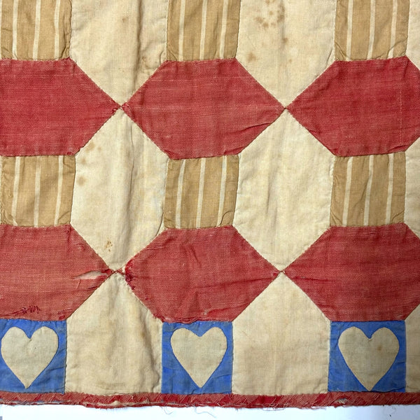 Among my very favorites of late, purchased from a favorite dealer and friend in Maine who is an endless source of things I love, and as tender feeling quilt as I can imagine, I believe made for a child (considerably larger than a crib quilt, but not full sized.) And who wouldn't feel safe and loved tucked in surrounded by those marvelous hearts on all sides?! The blue of the squares behind those carefully hand-cut white hearts (each just slightly different than the next)is the best blue in the world, like the starry skies of Italian frescoes! Between the fabrics and the "M" embroidered on the reverse side, I believe this likely dates to the 1880s-90s. Clearly it was well used, and feels soft in all ways for it, all to the good in my opinion. This is one I would be very inclined to hang to enjoy in full all of the time, feeling to me almost like a complement/counterpoint to an American flag in its soft red white and blue palette, this one standing for love and tenderness.