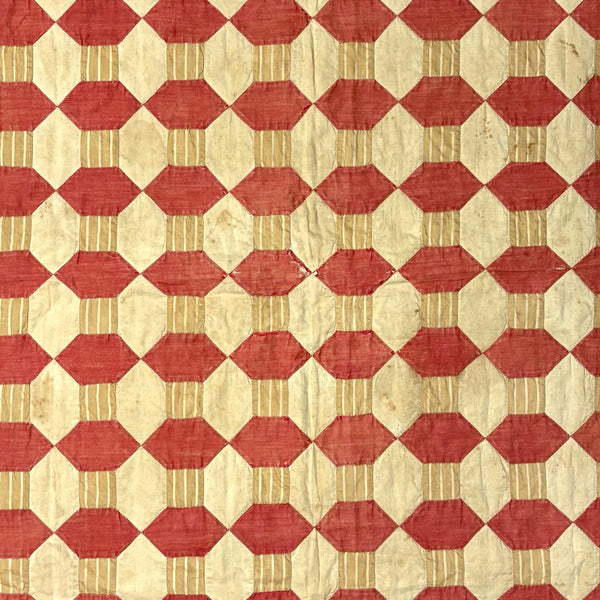 44" x 42". Well used, with general wear, fading/softening to the color, and small losses to the red fabric here and there. The wear feels very all over and of a piece with it, to me just enhancing what it is. Stable and not fragile.