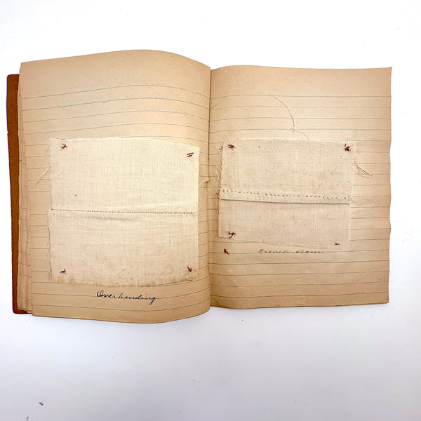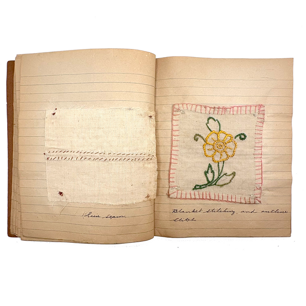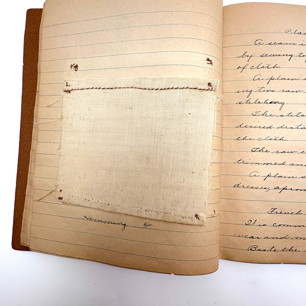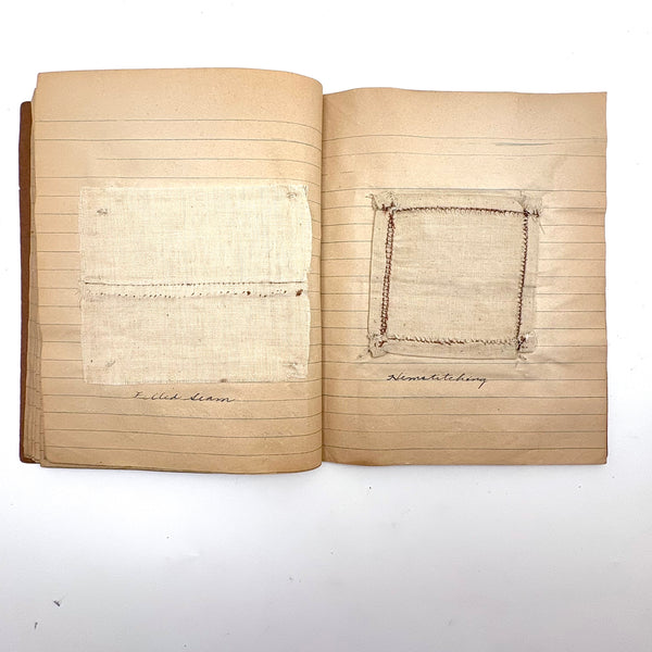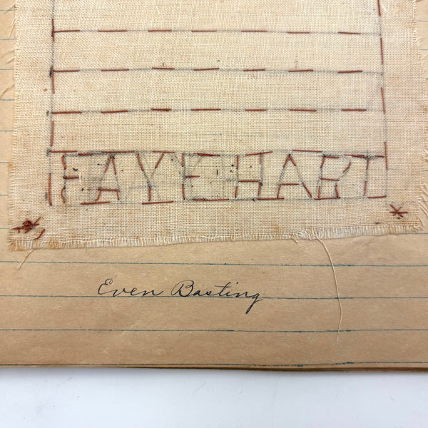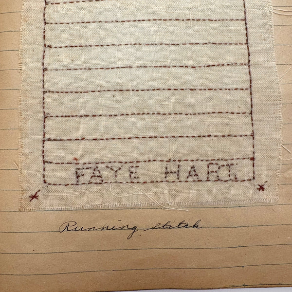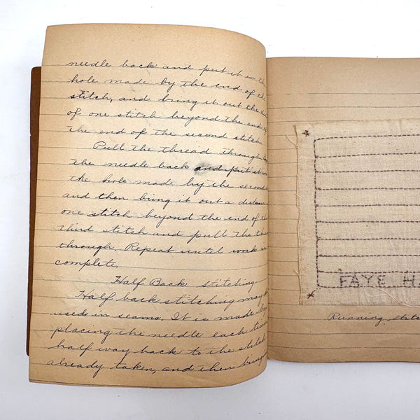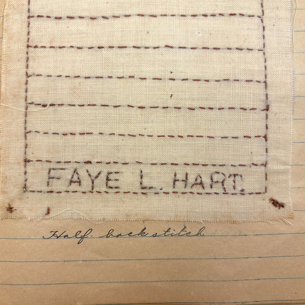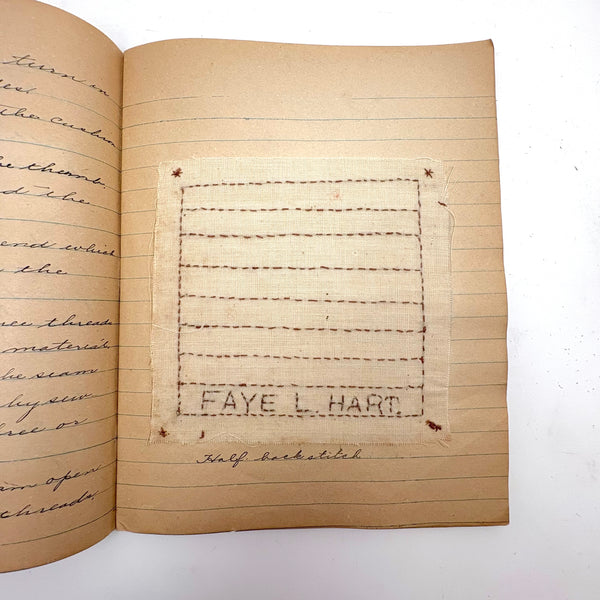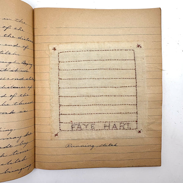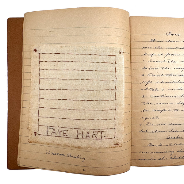 This is a really lovely, very good condition, and very comprehensive example of a sewing lessons/samples notebook, early 20th century, notable also for including extensive notes written in a nice hand--covering topics from needles to thimbles to various sewing techniques. But of course it is the sewing samples themselves that make it great, 18 of them here, many incorporating Faye Hart's name of initials, and all very nicely executed. Various types of stitches, hems, button holes, darning, patching, embroidery, etc. Photos document all sewing samples (I believe I captured them all!) but there are a good number of pages of handwritten text I didn't photograph. These are harder and harder to find and this is a great example.