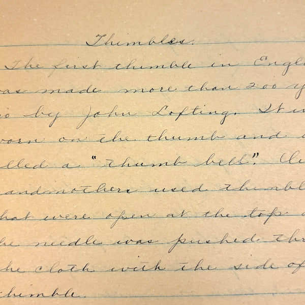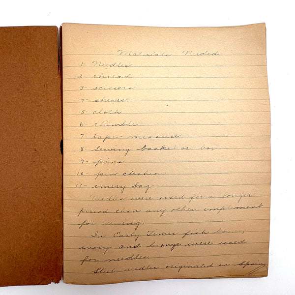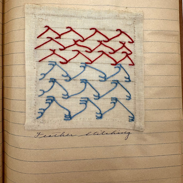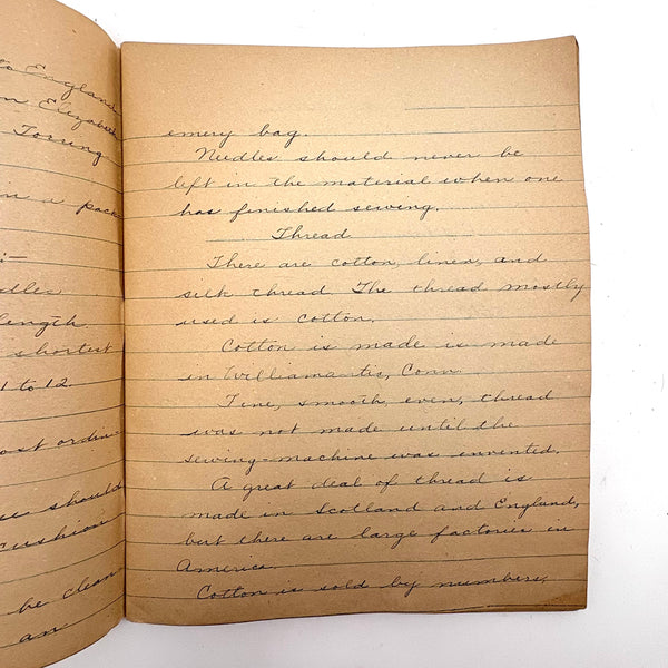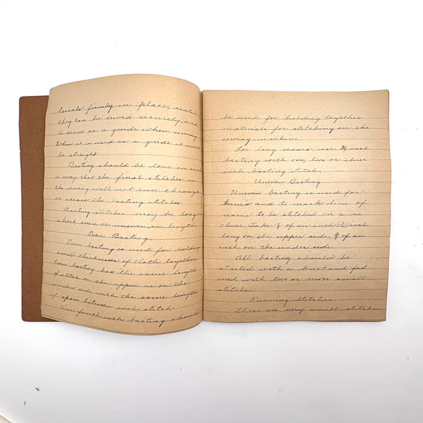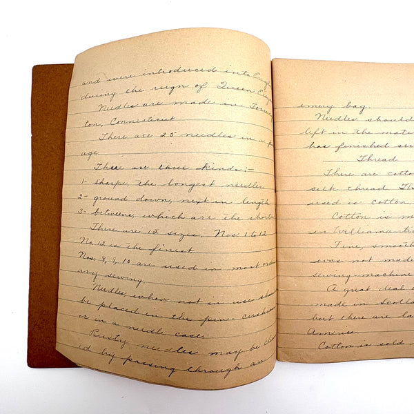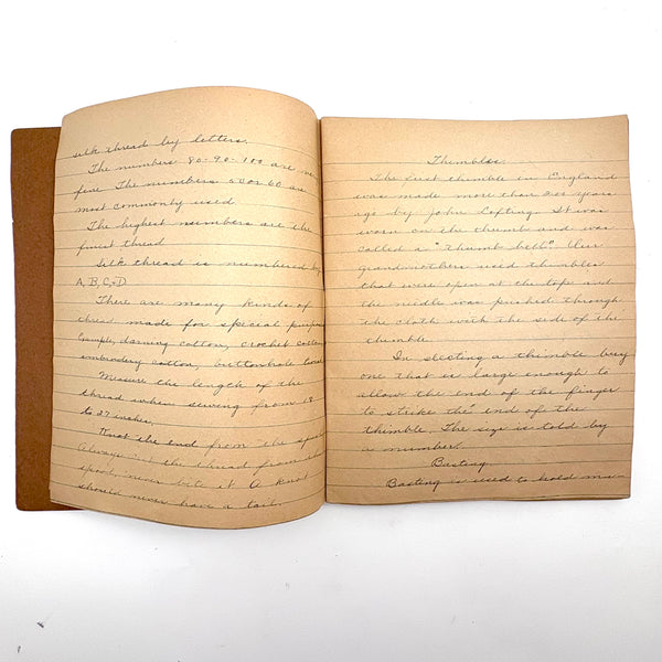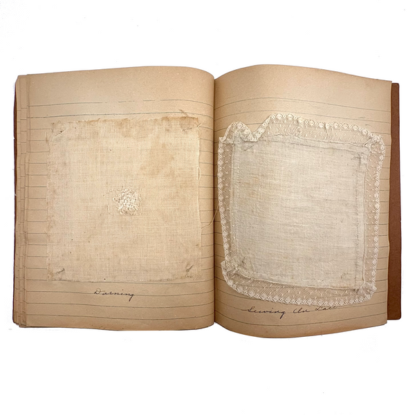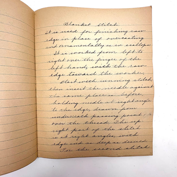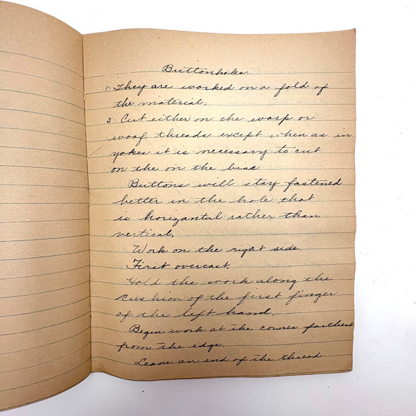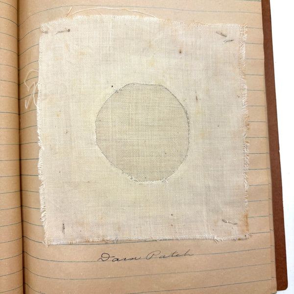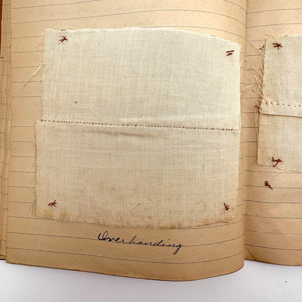 This is a really lovely, very good condition, and very comprehensive example of a sewing lessons/samples notebook, early 20th century, notable also for including extensive notes written in a nice hand--covering topics from needles to thimbles to various sewing techniques. But of course it is the sewing samples themselves that make it great, 18 of them here, many incorporating Faye Hart's name of initials, and all very nicely executed. Various types of stitches, hems, button holes, darning, patching, embroidery, etc. Photos document all sewing samples (I believe I captured them all!) but there are a good number of pages of handwritten text I didn't photograph. These are harder and harder to find and this is a great example.