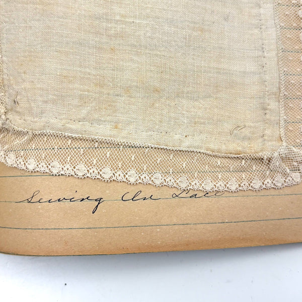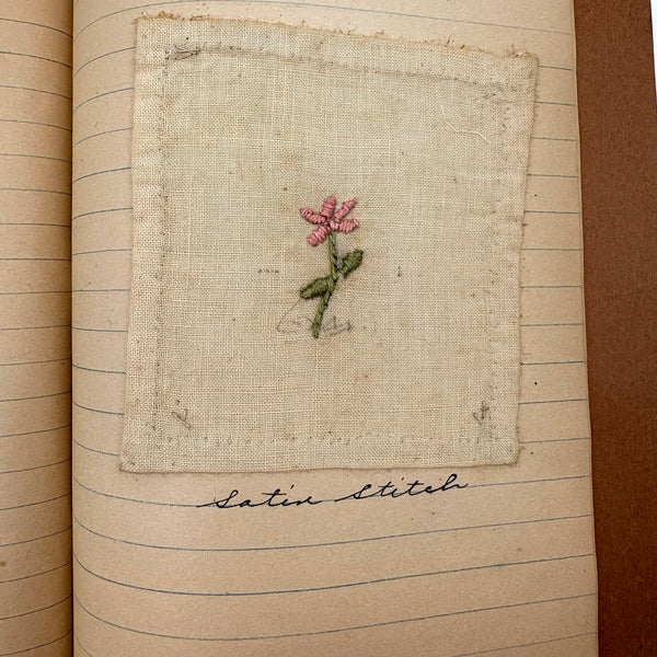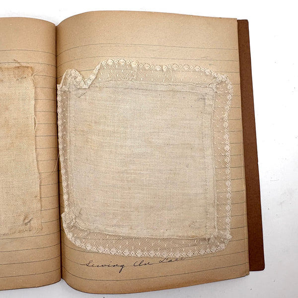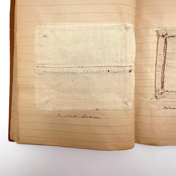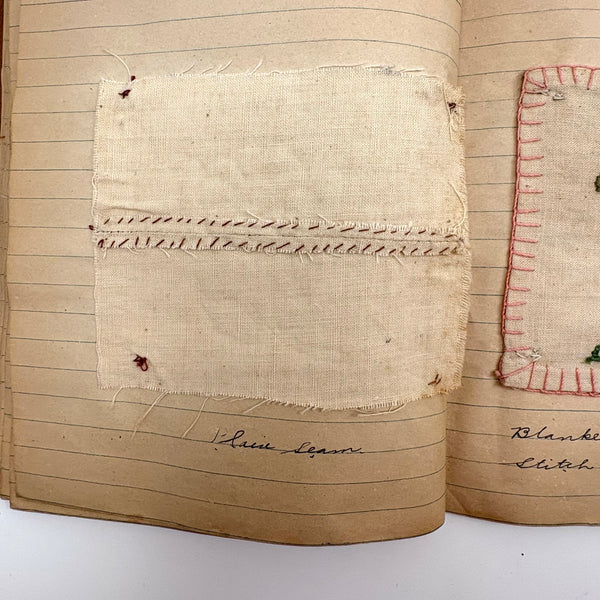 8 7/16" x 6 11/16". 27 pages used, most filled front and back, with about 9 more blank pages. 18 sewing samples stitched to pages.