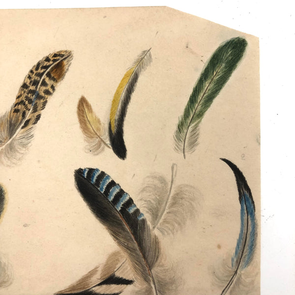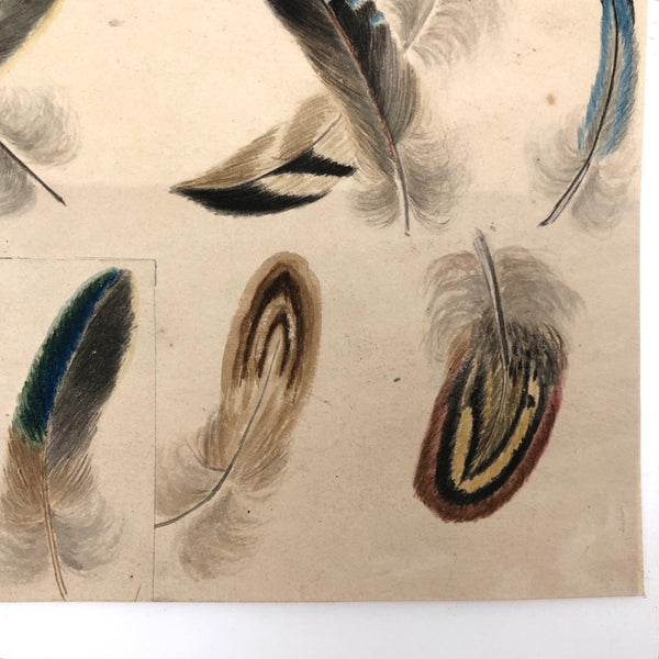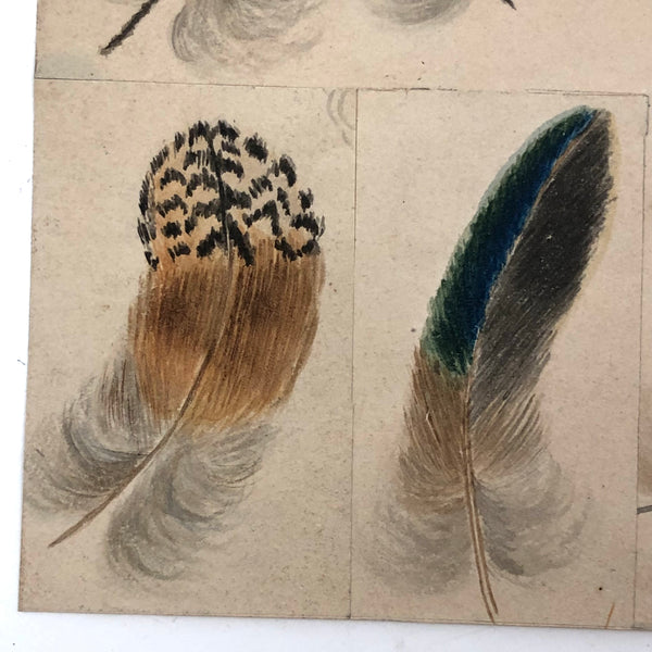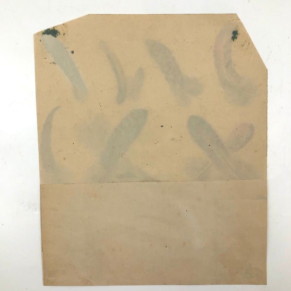 6 3/4" x 5 5/8" Very good condition, clean and bright, with cuts to the upper corners as evident. It appears as though the two bottom left feathers were individually cut out and adhered to the paper, perhaps covering earlier versions--original to it I am sure.