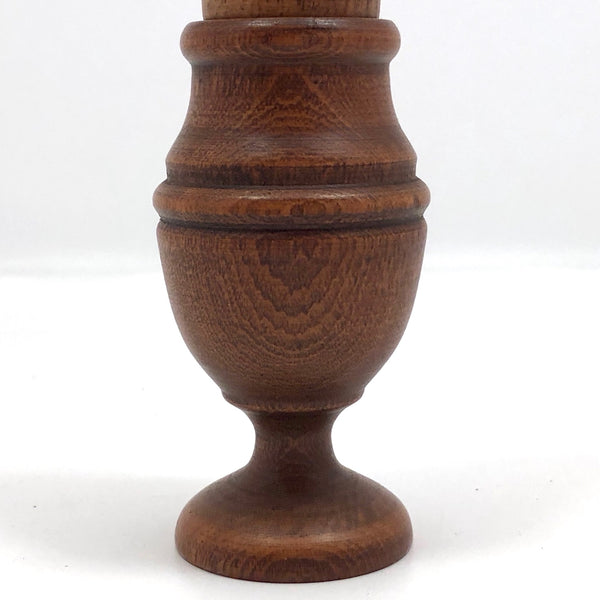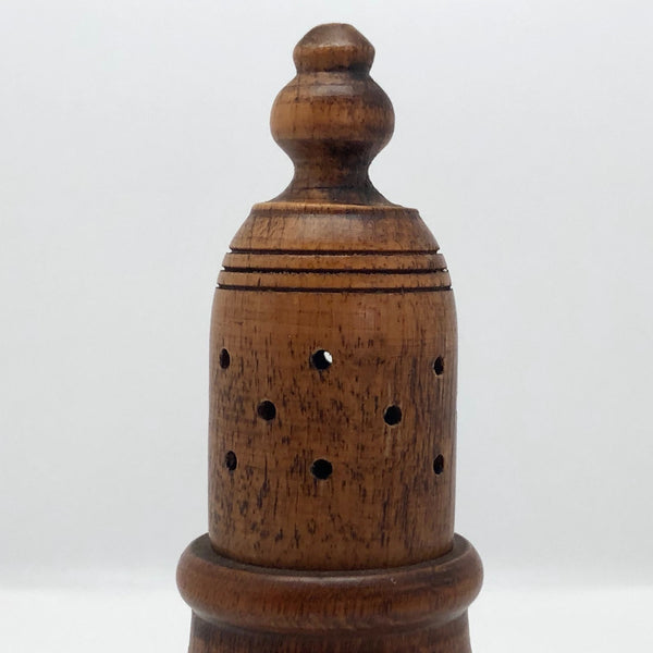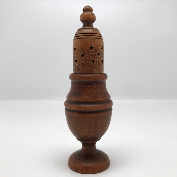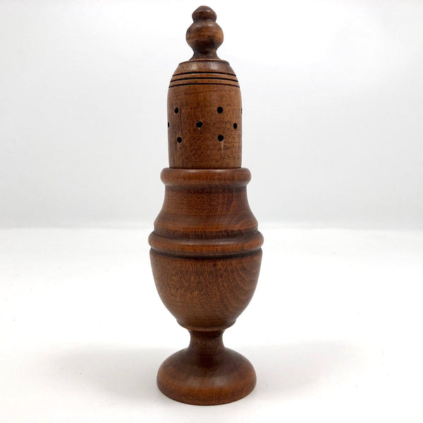 I have found what appears to be an exact match of this treen Georgian style salt shaker described as 18th Century Colonial (and which sold at auction, with a matching pepper shaker, for $750.) I am not sure this piece is that old-- I think perhaps mid- to late-19th century--but certainly it is very finely made, lathe turned, of a beautiful hardwood. I have also found "muffineers" of the same style, used for sprinkling cinnamon or sugar on muffins; I believe those are distinguished by an even denser pattern of holes, but surely this could be used for that as well!