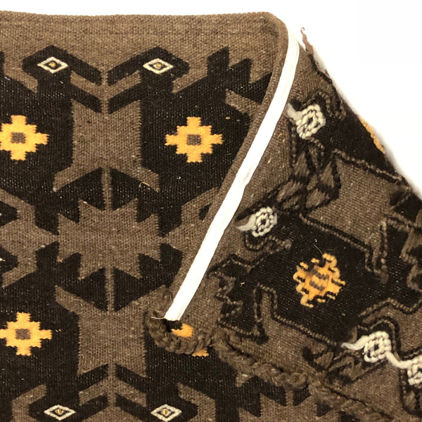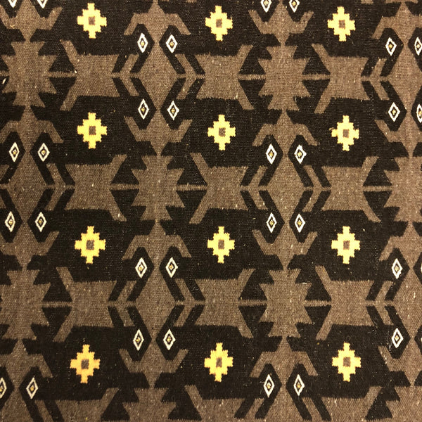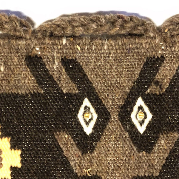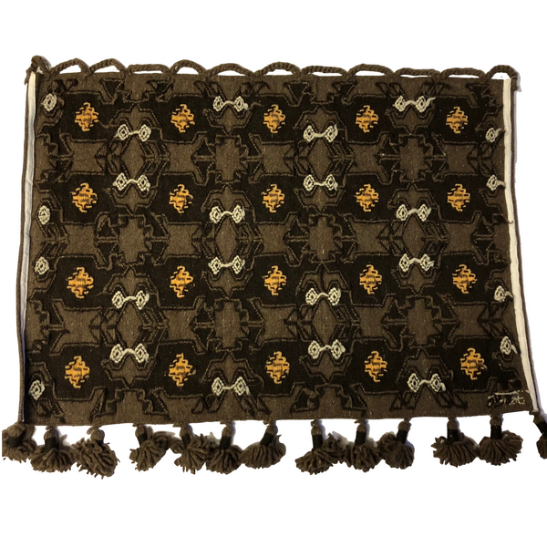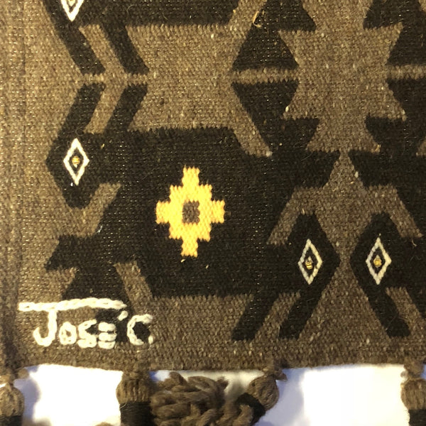Signed Jose C, this exquisitely crafted wool tapestry was created by Jose Cotacachi, a prominent master weaver based in Peguche, Ecuador, a few miles from Otavalo, a hub for weaving since pre-Inca times. I love how the design plays with optical perceptions: focusing on the light brown it reads as a series of repeating abstract geometrical patterns, but focus on the dark brown and a repeating animal motif reveals itself, which operates both horizontally and—turn your head or the image 90 degrees—vertically as well. Shiny little beads woven in give sparkle to the eyes of the creatures, to boot. Plus, the pom poms at the bottom! I think it just stunning and would hang it somewhere strategic for facilitating meditation or just zoning out.