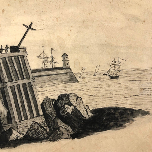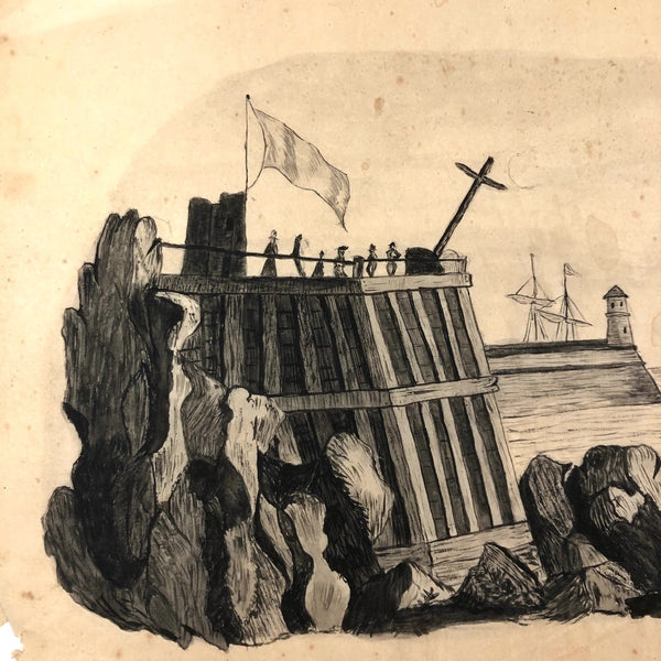 A super moody and rather gothic feeling 19th c. ink drawing on paper, with tilted cross atop this lookout platform seeming to me either to forbode a coming disaster or to mourn one having recently occurred. I love the row of tiny figures in their various hats arranged under the waving flag, and how the lighthouse on peninsula in the distance partially blocks a view of a tall ship behind. Picturesque seascapes are lovely, but this drawing, to me at least, captures more of the real drama of Victorian era life lived by the sea.