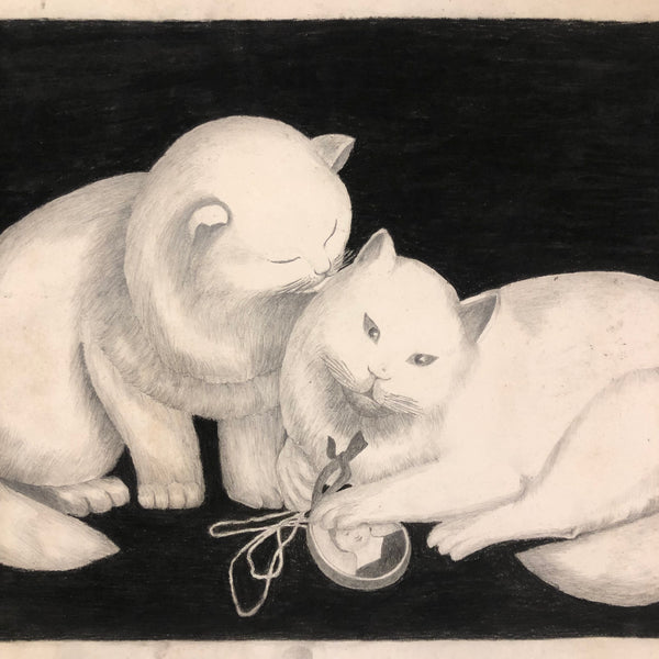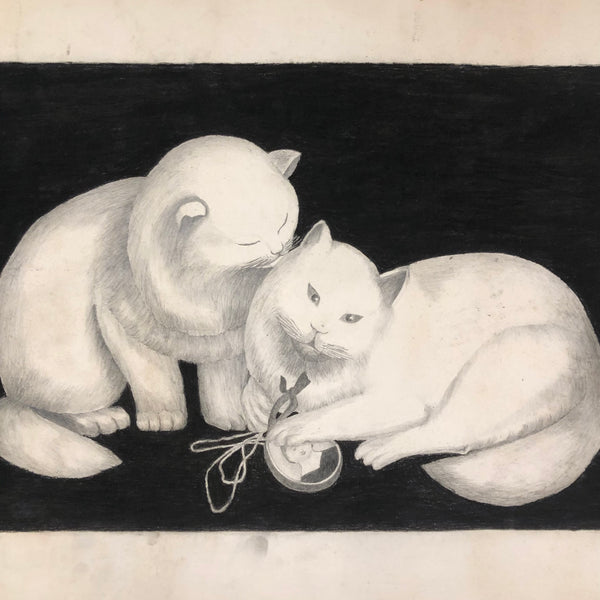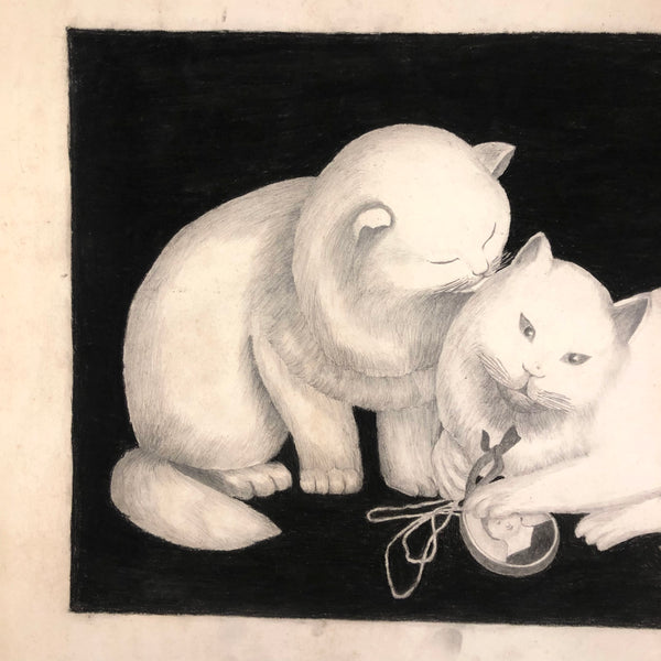 Fluffy White Cats with Portrait Miniature, Charming Old Graphite and Charcoal Drawing