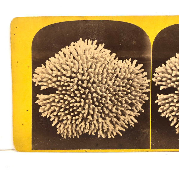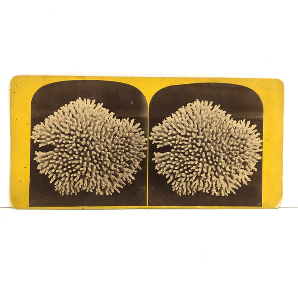 The combination of these two closely cropped, tombstone top photos of coral against matte yellow mat just completely does it for me. Perfect. 1870s I believe, with printed list of other stereoviews in the series on reverse.