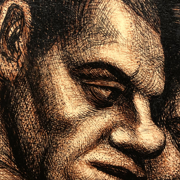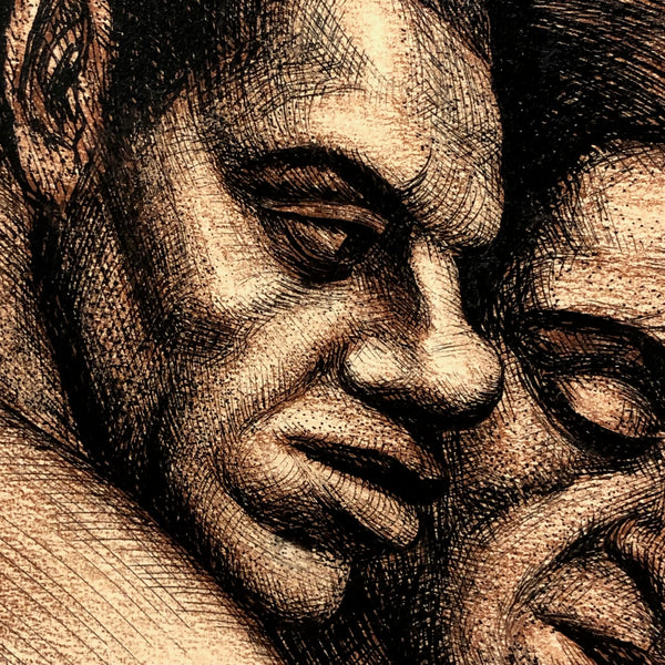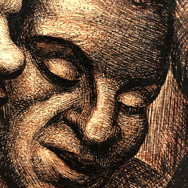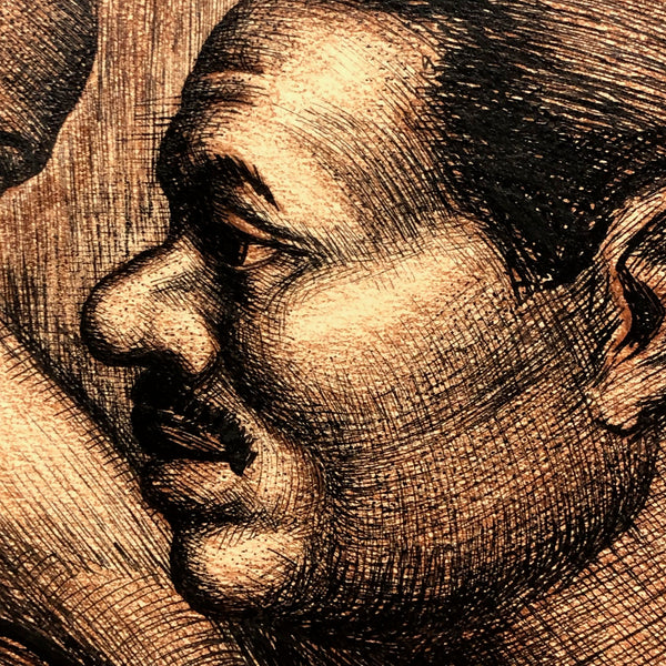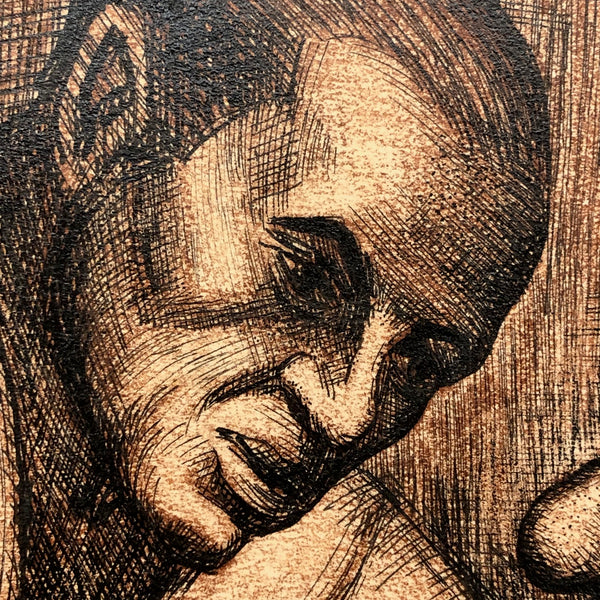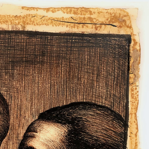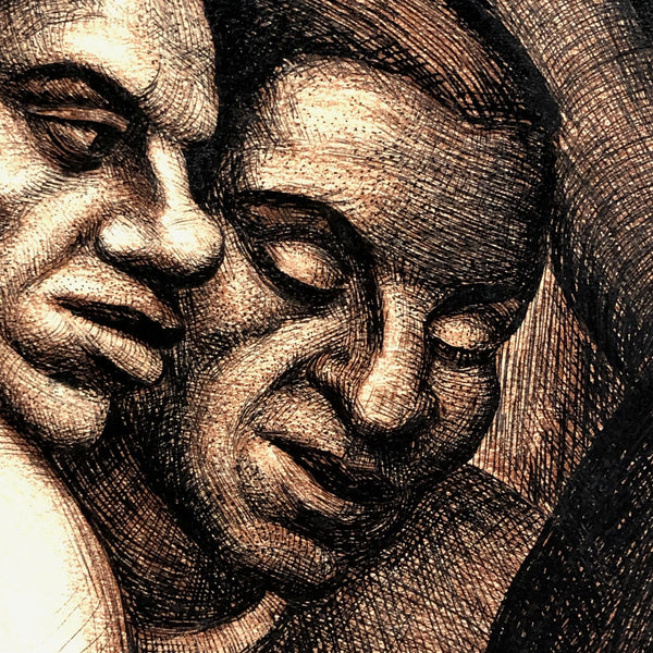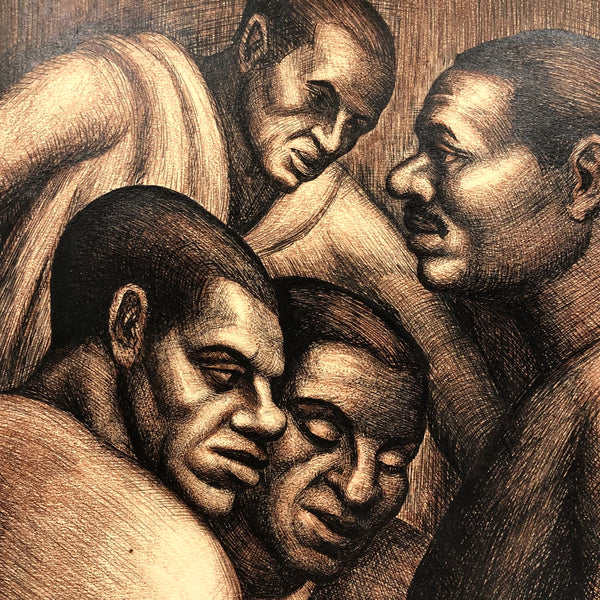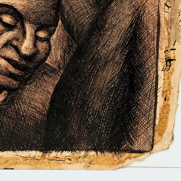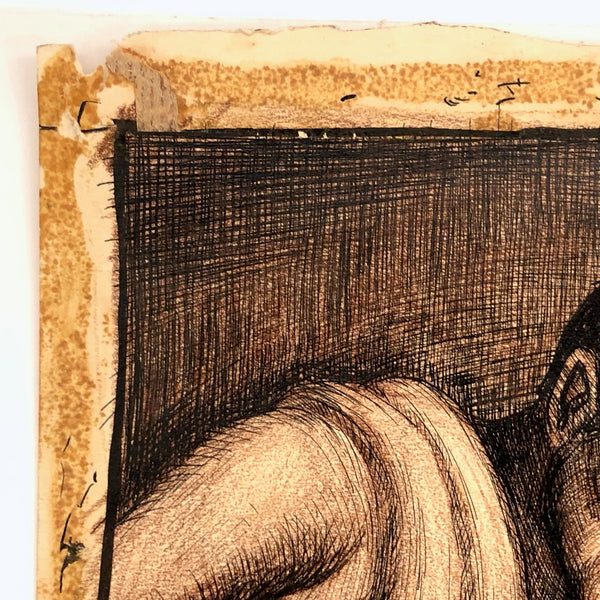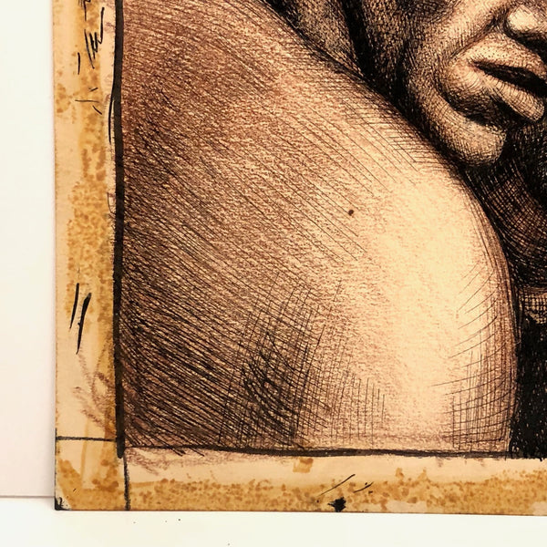 I extricated this gorgeously executed drawing, rendered in a combination of black and sepia toned ink on heavy weight paper, from its original mat, to which it was adhered with rubber cement, visible now around the edges of the paper. That mat (which I've saved) was signed F. Robinson--which has lead me nowhere, but clearly he, or she, was quite an accomplished artist. Four marvelously distinctive portraits packed into one dense and dynamically composed image, with a terrific ambiguity about the situation that brings them together and what is happening just outside the frame. To my sensibilities, just the sort of piece on wants to live, never to be fully known but to consider anew every time one looks at it.
