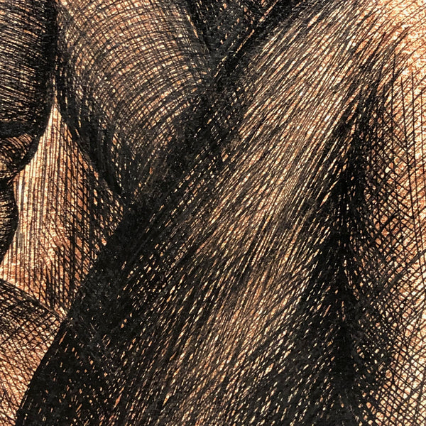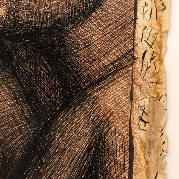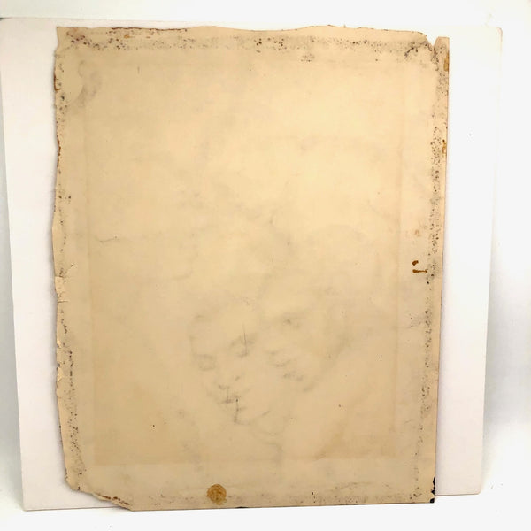 Paper: 14 x 11 1/8". Drawing area: 12 1/4" x 10. Old rubber cement stains (not sticky) around the perimeter as evident, and small corner losses, but drawing itself in excellent condition, and with a new mat and frame it will completely sing.