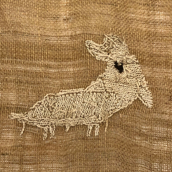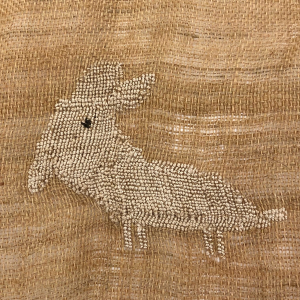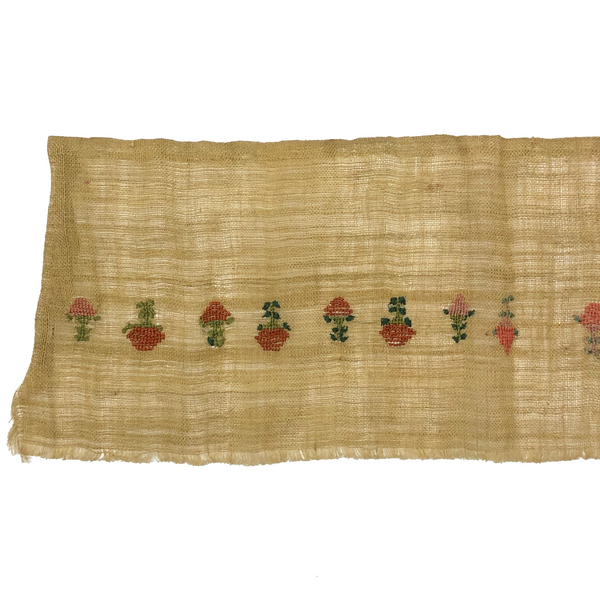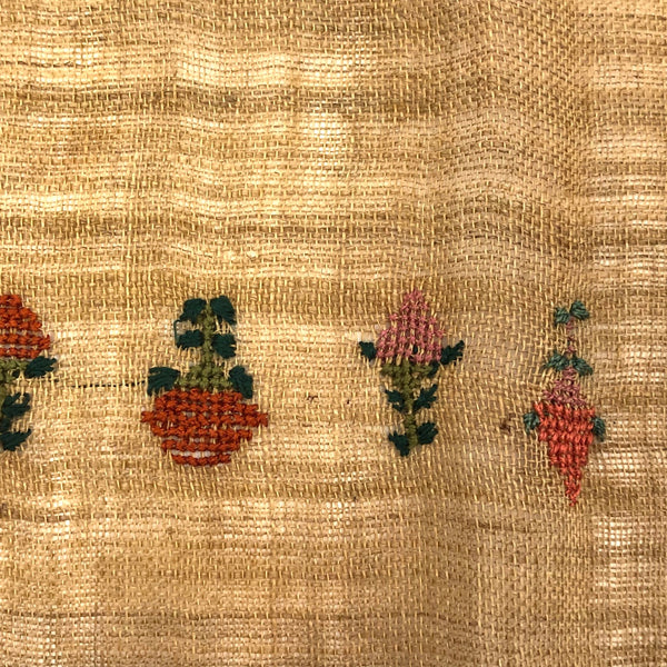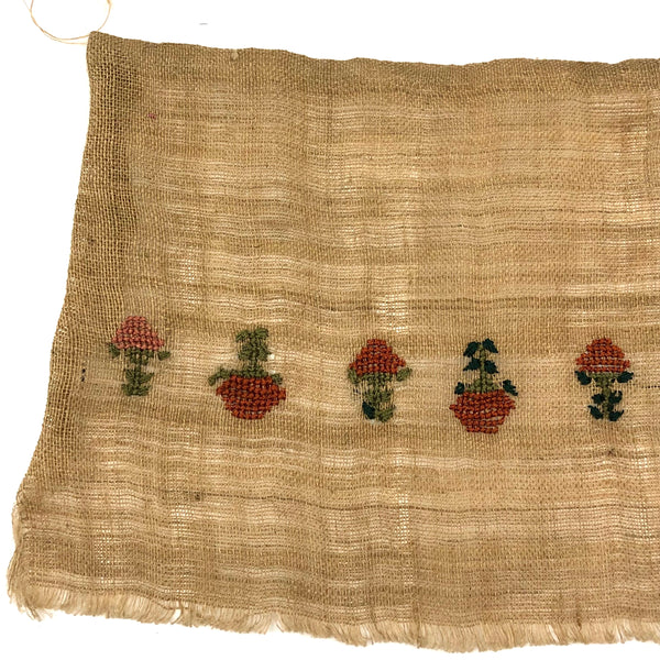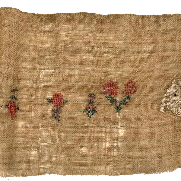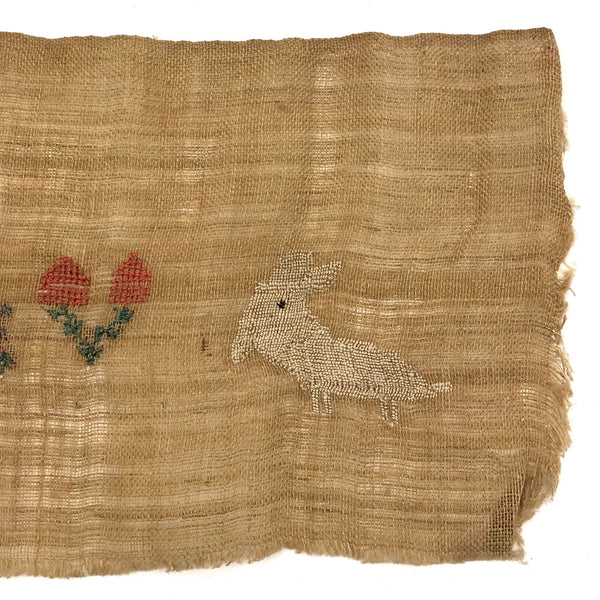 This bunny! At least I believe that's what it's meant to be, and in any case a creature completely after my own heart and one of my favorites ever. I also like the idea that the creature, standing at the end of this long row of flowers (right side up, upside down, splitting into two), seems poised to nibble its way all the way down the row! Surely the work of a young girl, 19th century, on homespun linen, completely charming.