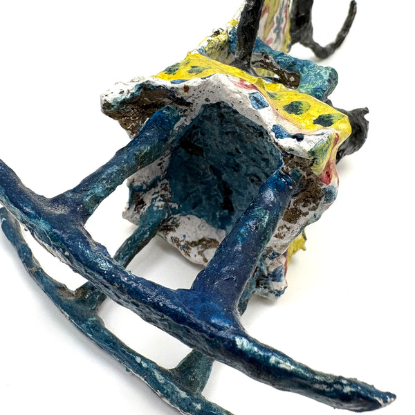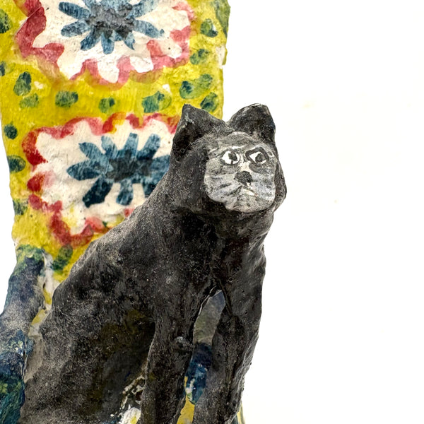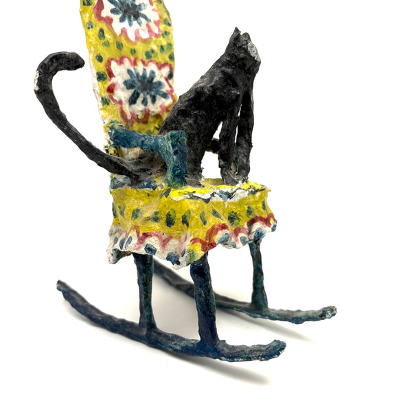 I found this one at a shop close to home, and know that it had just been retrieved, along with some other cat related objects, from the estate of a cat fanatic. Later 20th century I think, papier mache with polychrome. I think the faces on the cats--and their long tails, too--are pretty great, and the exuberant but also cozy feeling patterned yellow chair feels total proud "cat lady" to me.