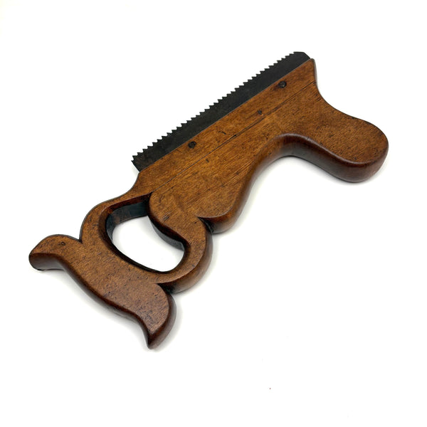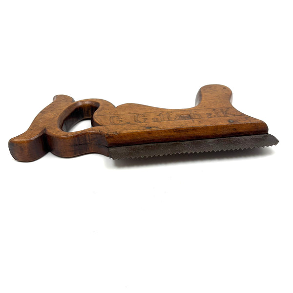 Among my very favorite recent finds, especially for the pin prick style lettering spelling out the maker/owner of this antique saw's name, and most especially for them having taking the care to correct a not quite right first attempt at the "e" in Goffsehalk, carving the wood a bit deeper there to allow for a second try. I have found other early examples of saws of this shape called both kerfing and stair (dado) saws, the earliest examples seeming to have been used by coffin makers in the 19th century for precision cutting. I am no tool expert, but whether employed for making coffins or stairs, I have to think G. Goffsehalk took great care and pride in his work. A special feeling and very lovely thing.