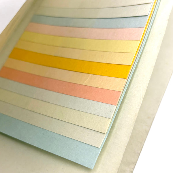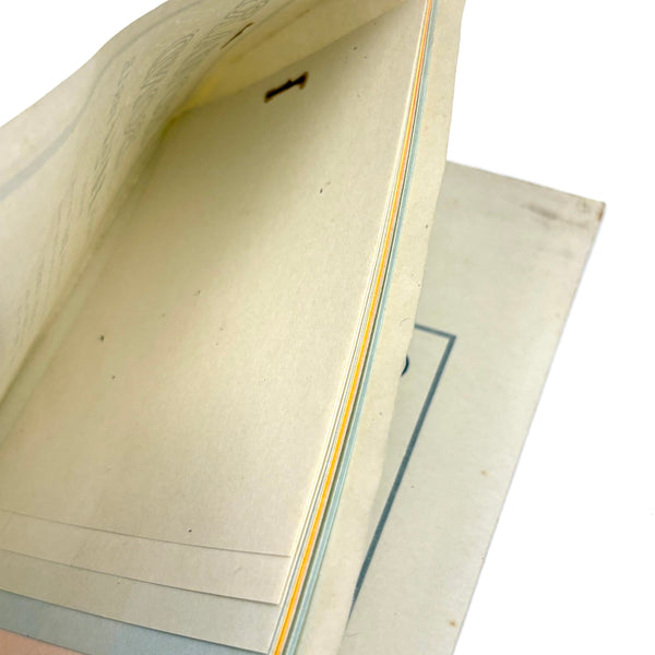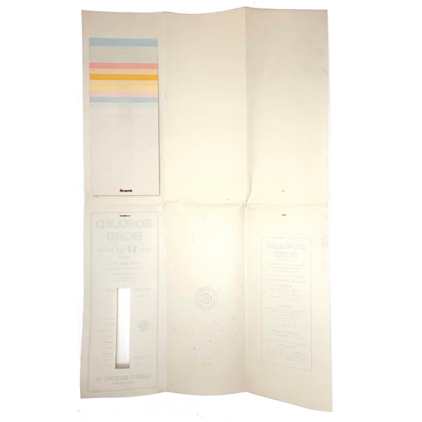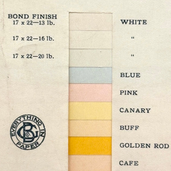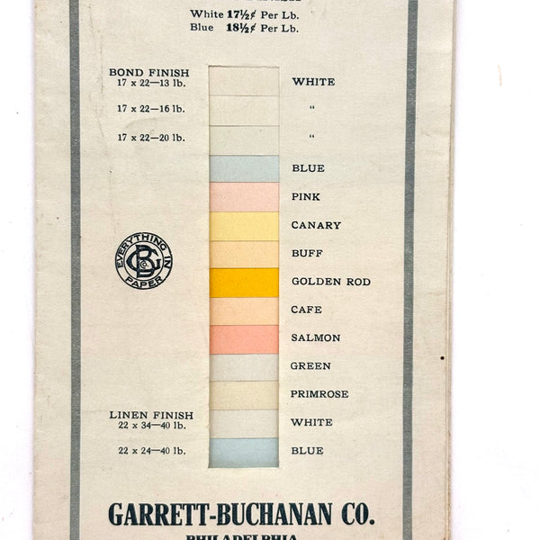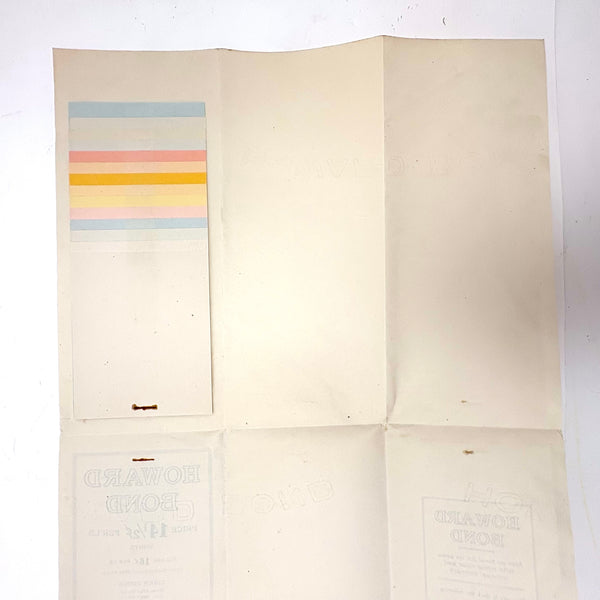 I've been especially attentive lately to paper and fabric and thread and ribbon color sample cards of all sorts--very much about the joys of color, both subtle and bold, but also about their design, and tactility/tangibility, and orderliness, and sense of creative possibility! Anyway, the Howard Bond paper samples here are lovely, with the colors like sherbet flavors, and I like the the long narrow cutout window through which one can view them, like a test strip. (One can then unfold the whole thing to get to the larger stapled down paper swatches) Garrett Buchanan Co. Philadelphia, c. 1920s.