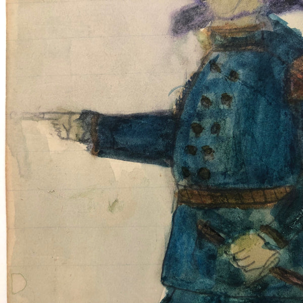 Meredith (1810–1875) was an Indiana farmer, politician, and lawman who became a Union Army General general in the Civil War, leading the brigade in the Battle of Gettysburg. Quite an interesting life he lead, and seems quite a spirit of independence captured in this watercolor, which I love especially for the rich blue, and his boots, and the fact that he seems to be firing a bullet from his pointer finger!
