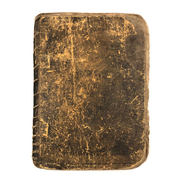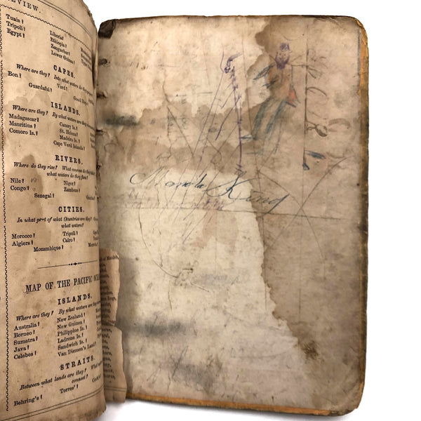 I don't mind if I never sell any of these old school books with doodles and drawings inside; I'll keep buying them and build a collection for myself! For me, they feel like small, singular treasures, with the handwritten names and sketches of their onetime owner (or numerous owners) animating their end pages like escapist fantasies in counterpoint to, or sometimes inspired by, the lessons inside. The inside over of this 19th century geography book features George M in lovely blue/purple ink/watercolor letters, and then these exuberant graphite and ink flowers below as well as a few more interactions of George and lots of flourishes. On the back inside cover is a great little drawing of a man in orange coat. The book itself, with lots of maps, is in rough shape inside, with all sorts of torn and worn pages, but the exterior I find quite beautiful, especially for the string binding.