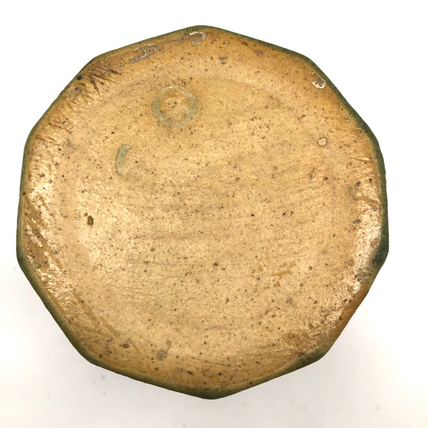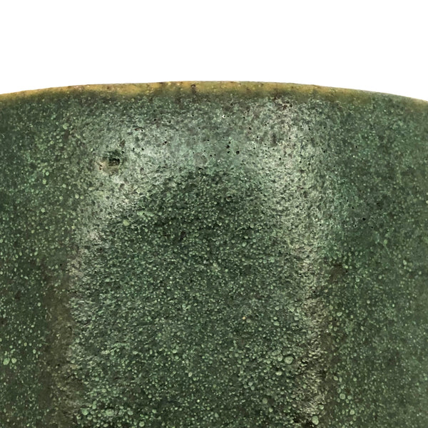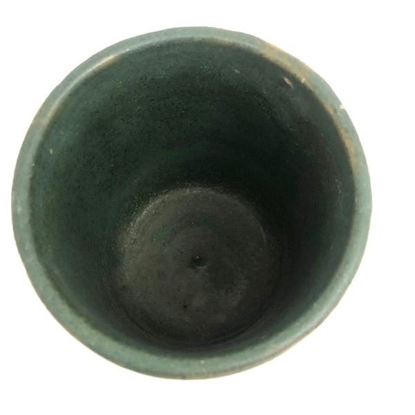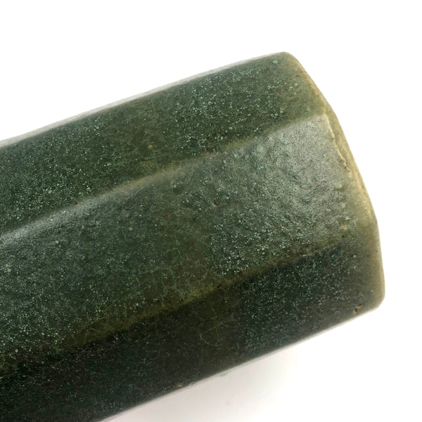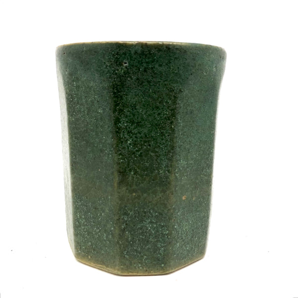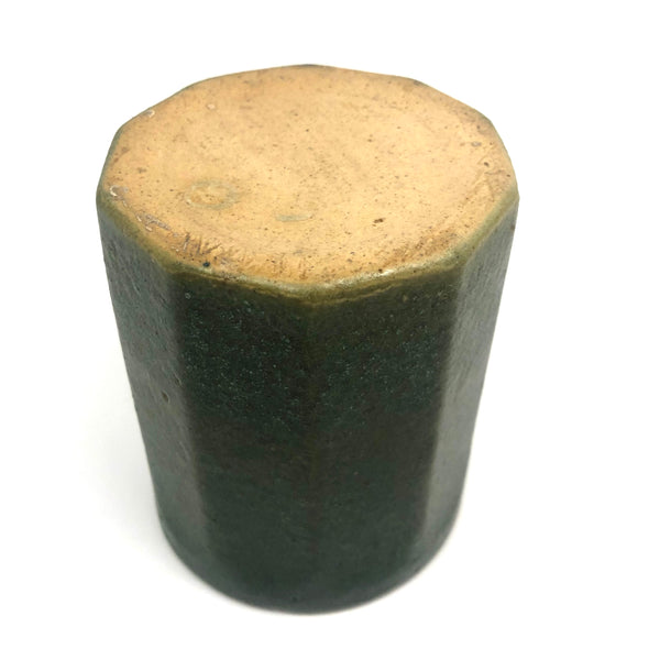 Perfection. I purchased this at Brimfield from a seller as obsessed with matte green Arts and Crafts era glazes as I am--and we agreed on this as about the most perfect, super rich green we had--have--seen. Plus this gorgeous faceted form, beautiful and a very satisfying thing to hold. Of a large tumbler scale, it could be used for a big cup of coffee, but I'd be inclined to use it as a vase, perfect for red berries on a holiday table or for a bunch of daffodils in the spring--or anything.