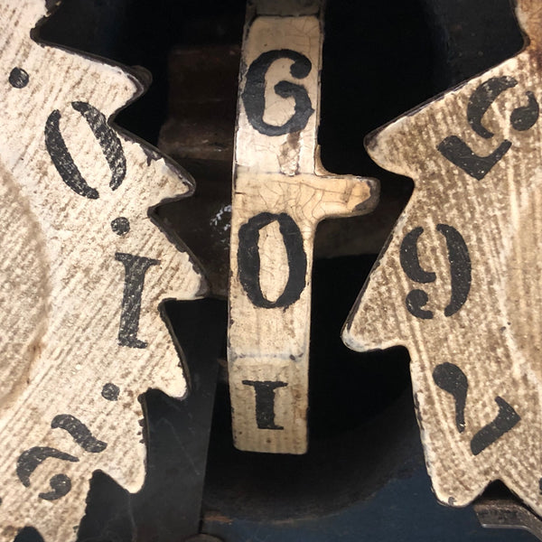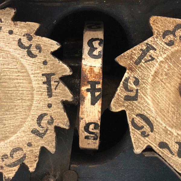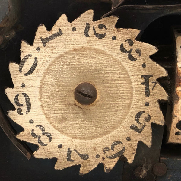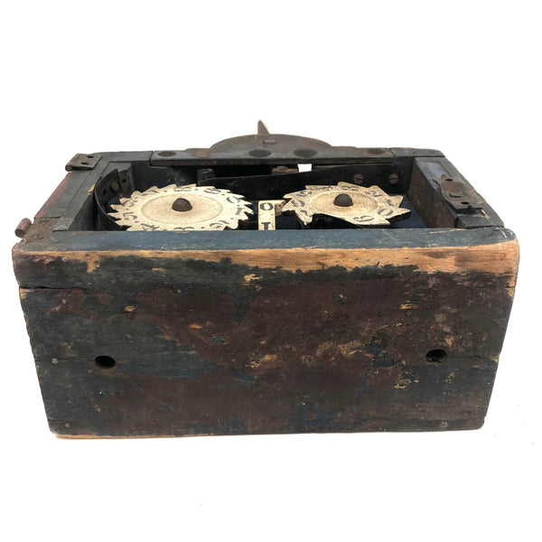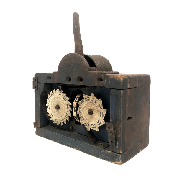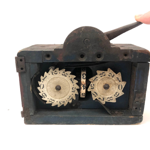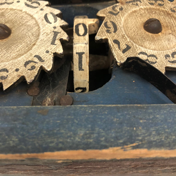 I am completely smitten with this thing, in significant part due just to the looks of it, but also for the pure pleasure of pulling the lever and watching the sawtoothed, numbered disks tick forward, with ten ticks on the left dial advancing the middle one, and a hundred ticks finally advancing the right dial one tick. Gorgeous black painted stenciled numbers against creamy white, and old blue paint on the box. To me, satisfying on every level and one might use it now to count all sorts of things up to 1000.