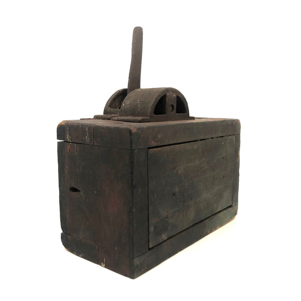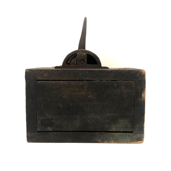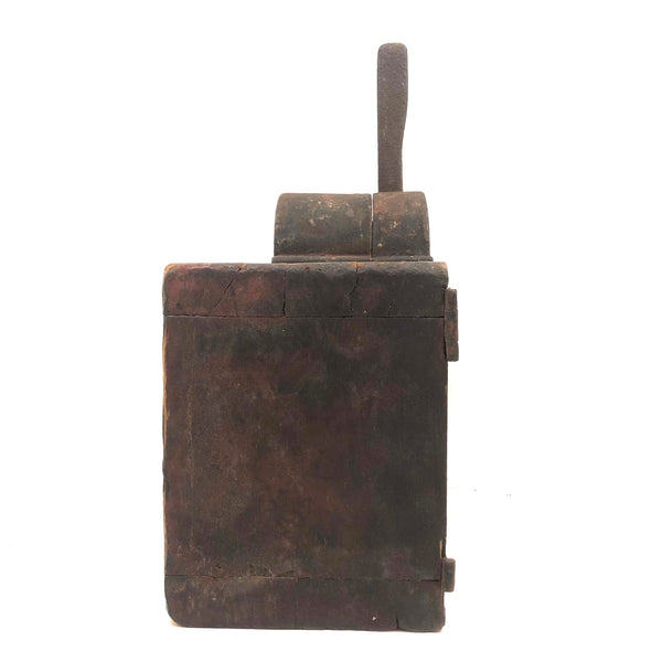 Some trial and error led me to learn that this was a counter/tally box was used together with a threshing machine, powered by horses. The horses as I understand it would be hitched to something like a big wheel, with gears in the middle that turned a shaft and powered the thresher. As the grain came out of the thresher, someone would shovel it into a bushel container. Once full, they would hit the lever on the box, tracking the amount of grain harvested.