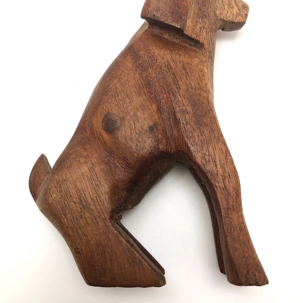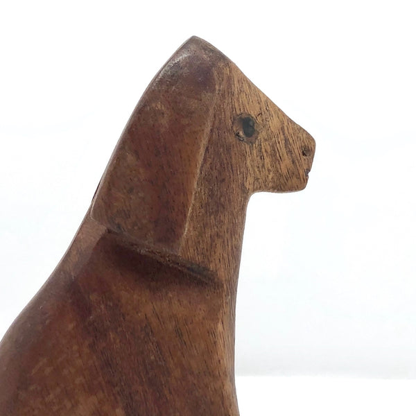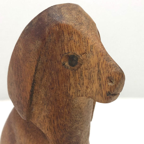 Photos don't quite do justice to this really wonderful carved dog, which, with these long, floppy ears I'd guess represents a hound of some sort, or perhaps a lab?--and I have to think a much beloved one, as it has a very soulful face and presence! At 5 1/2" tall and with a nice weight, it feels substantial, and to my eye beautifully merges a mid-century elegance with a more folky sensibility. Really a lovely one.
