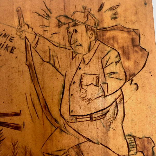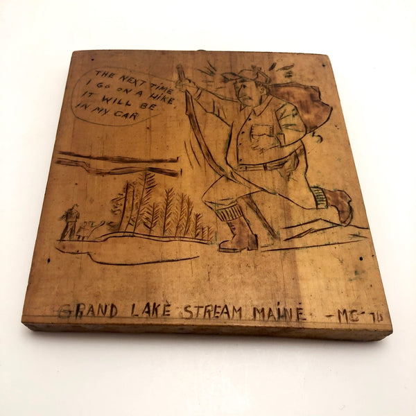What I love most about this funny old carved souvenir plaque are the two tiny figures at lower left waving to the hiker protagonist from a distance; I'm not sure whether they completed the hike hours ago and are waiting on the slow father, or whether they are random bystanders just cheering him on! In any case, I think it's pretty good, and a fun gift for a reluctant outdoors-person.