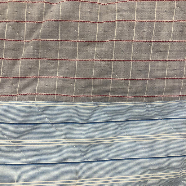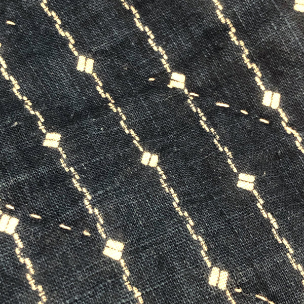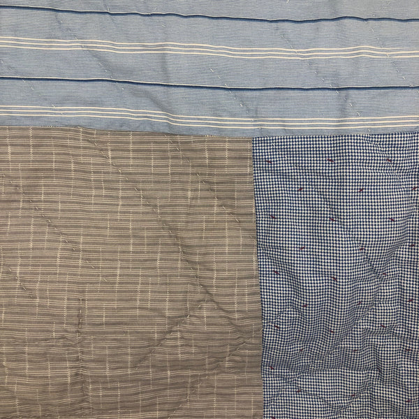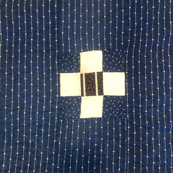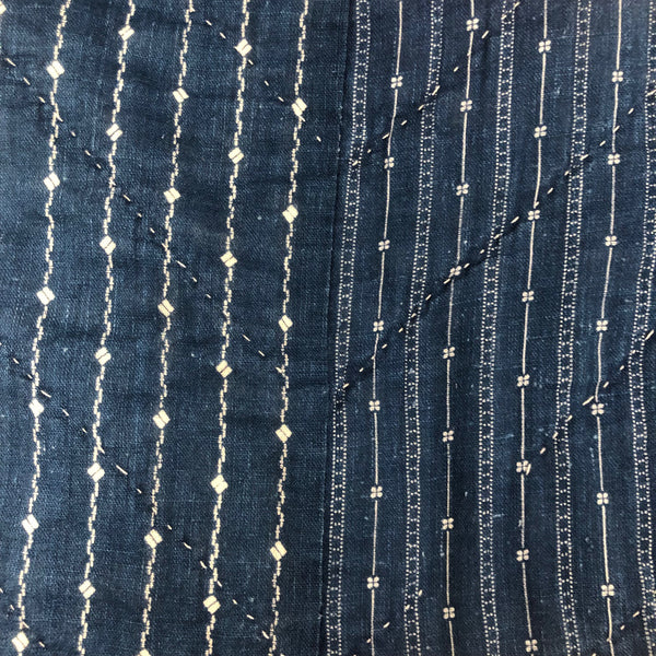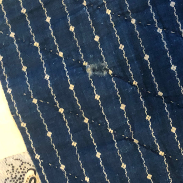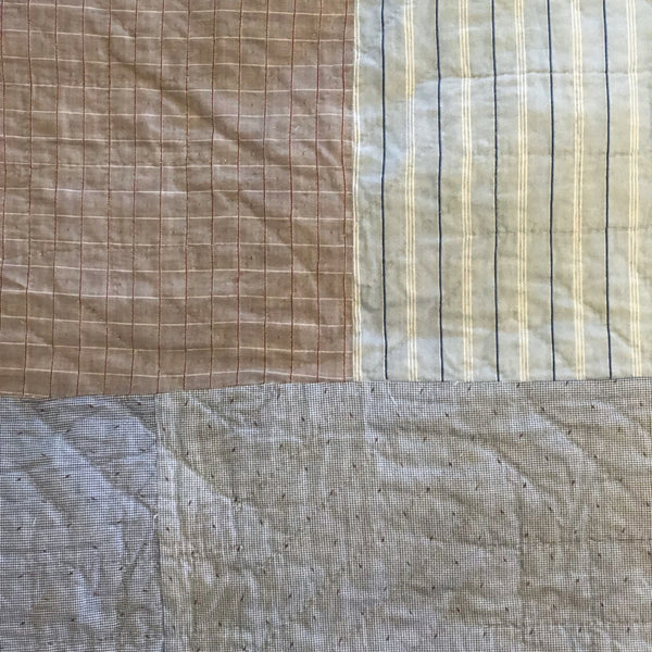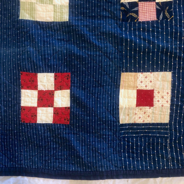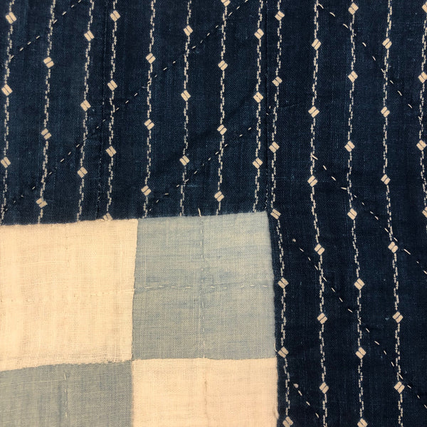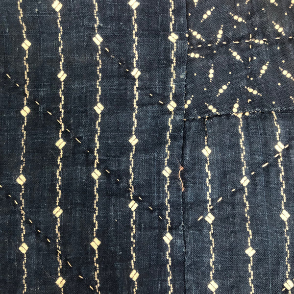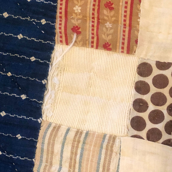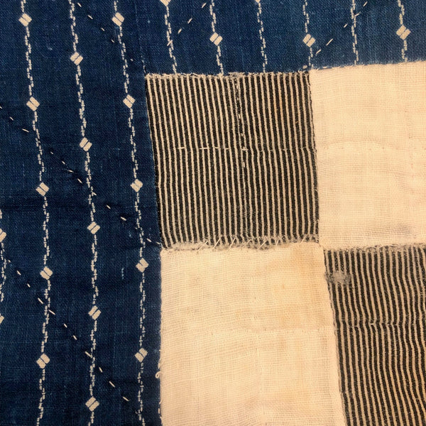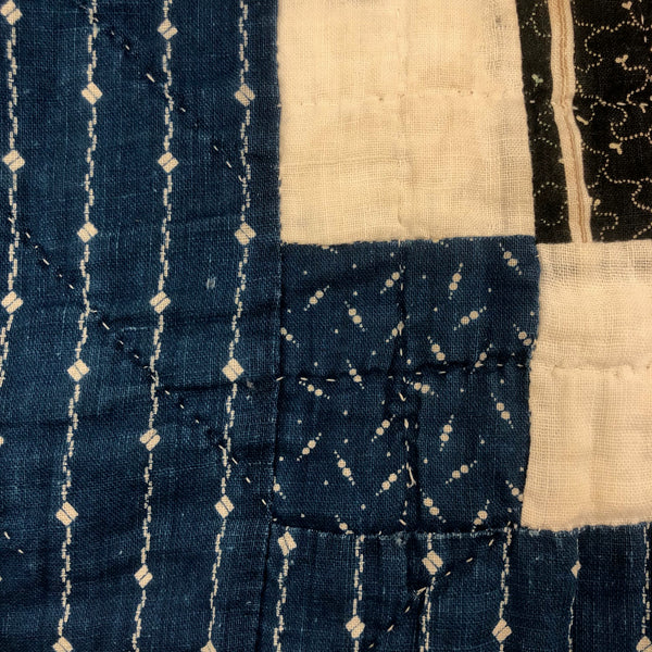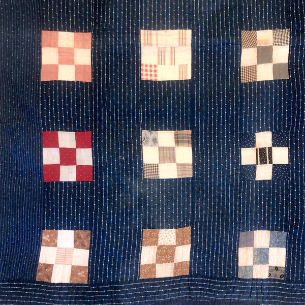 I don't deal much in quilts, though if they were easier to photograph I would! (Forgive my not great photos here taken in crummy lighting.) I made the leap with this one though, the bold graphicness of these piecework squares in a grid of five by five against indigo blue calico I couldn't resist, and with a nice play among a few different indigo calico prints used that lends another layer of interest and complexity to the grid. Plus a beautiful shirting fabric back that makes me think of Anni Albers. C. 1940s or so I believe, all cotton, light in weight, hand-pieced and hand-quilted.