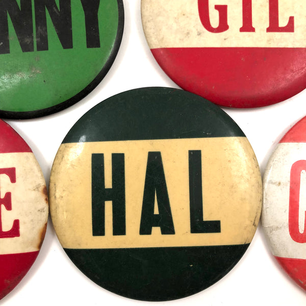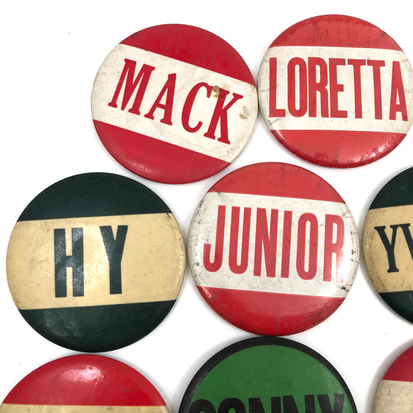 Such an excellent array of names on these oversized pinback buttons, which make me think of roller rinks and amusement parks of the 1970s. I don't know how this batch came to be together--but they've got enough scratches and dings to me it seem that they were indeed worn by a crew of workers somewhere rather than left overs from a rack somewhere. The fact that both Cherie and Candy are both represented, and Loretta and Hy, too, makes me very happy. I could think about these all day, inventing elaborate stories about each one and their intertwining.