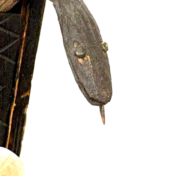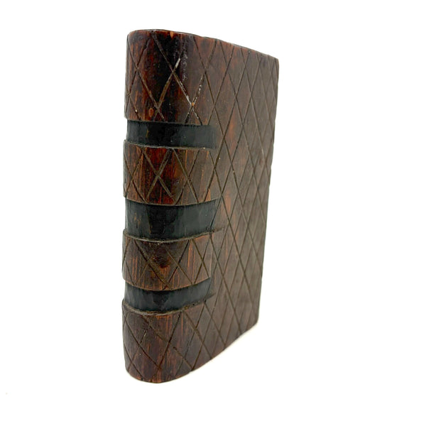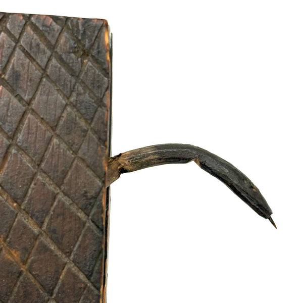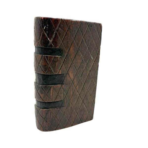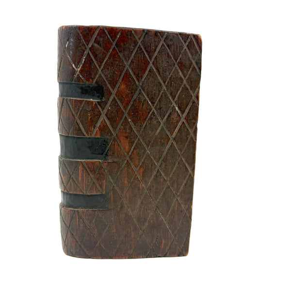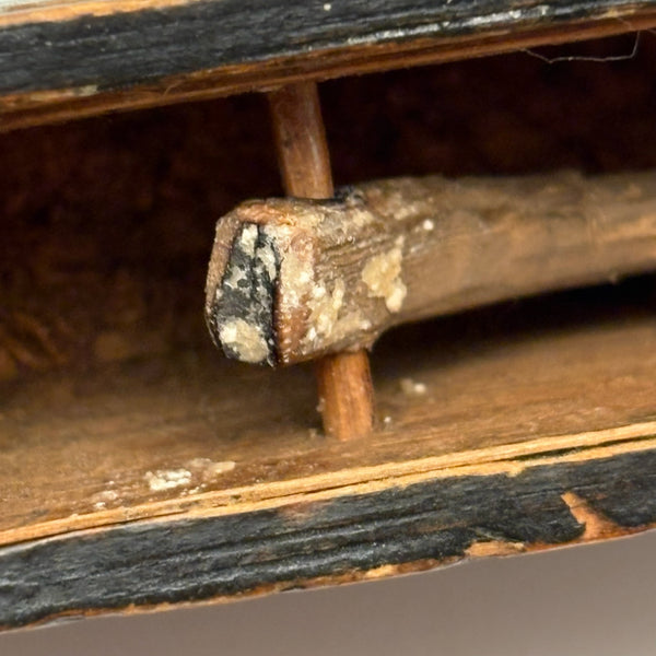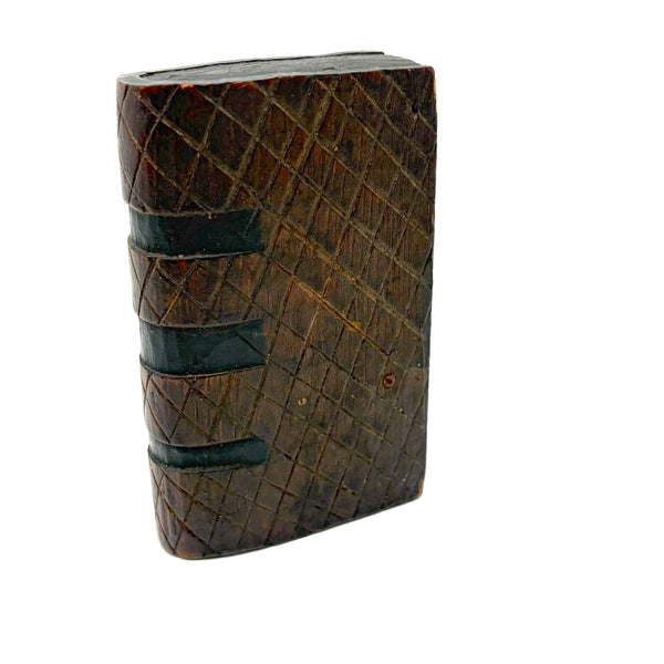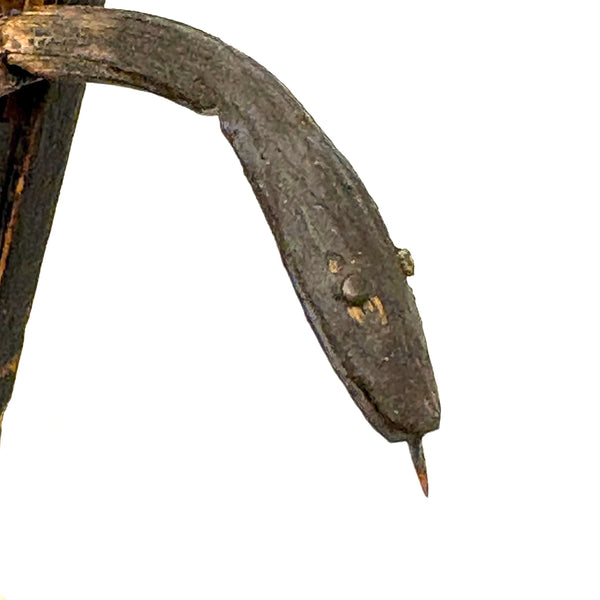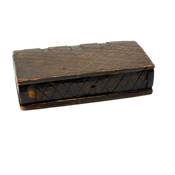 I purchased this one from a wonderful dealer in Pennsylvania, and believe that is quite likely where it originated, early 20th century would be my guess, though it could be a little older than that. There is a tiny hole in the slide that once would have attached via string or fine wire to the snake inside (with stained black arching neck and wonderful little nailed eyes and iron tongue) and pulled it forth to deliver a surprise to the opener! That string is gone, so the snake is now a passive one, though is easily pulled forth manually and will stay in in a head-arching-up position for display, as shown in first photo. I love seeing the snake, but it is also just an excellent looking carved folk art book box when closed up! There is a tiny loss to the very end of the slide lid on one edge, which might prevent it working completely properly if one were to try to re-tie it again and, but one could try--though I think it is excellent just as it is.