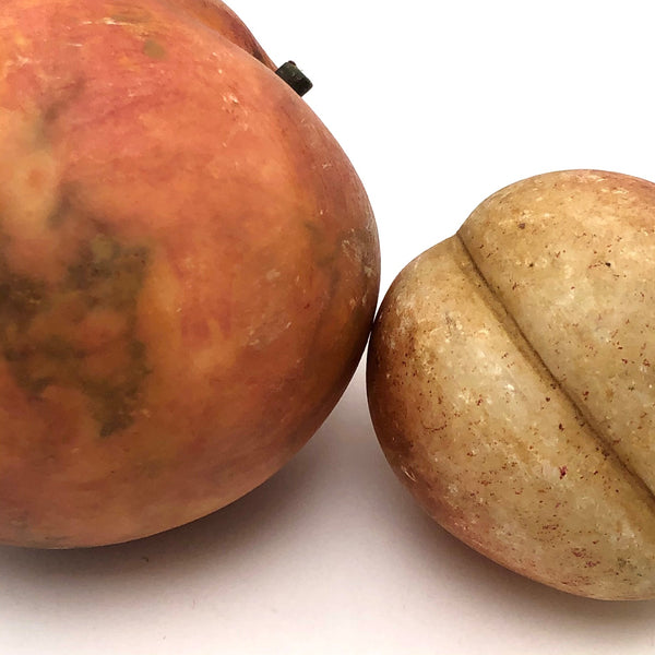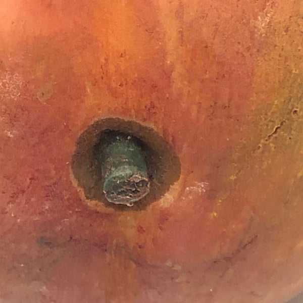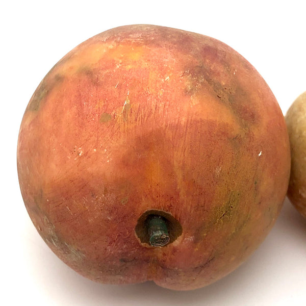 Photos capture the coloration well, with fantastic variation in color and veins in the marble contributing to its bruised appearance. The apricot is less unusual but very nicely done as well, with a nice blush of peach which I think makes it a perfect companion to the peach so am selling them together. Both have wooden stems, and apart from a little surface wear are in very good condition. Earlyish 20th century Italian I believe.